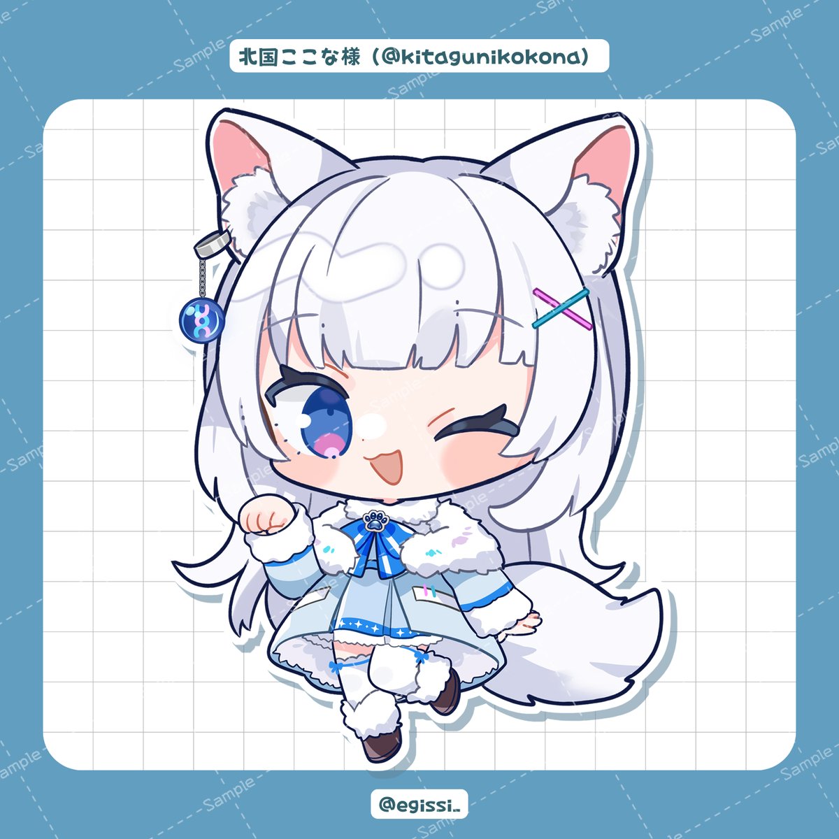 1girl ;3 ;d animal_ear_fluff animal_ears blue_border blue_bow blue_bowtie blue_dress blue_eyes blunt_bangs blush_stickers boots border bow bowtie brown_boots character_name chibi chibi_only commentary_request dress drop_shadow egissi fox_ears fox_girl fox_tail full_body fur-trimmed_boots fur_trim hair_ornament hand_up highres indie_virtual_youtuber kitaguni_kokona long_hair long_sleeves looking_at_viewer one_eye_closed open_mouth paw_pose sample_watermark smile solo standing standing_on_one_leg tail thighhighs twitter_username very_long_hair virtual_youtuber watermark watermark_grid white_background white_hair white_thighhighs x_hair_ornament