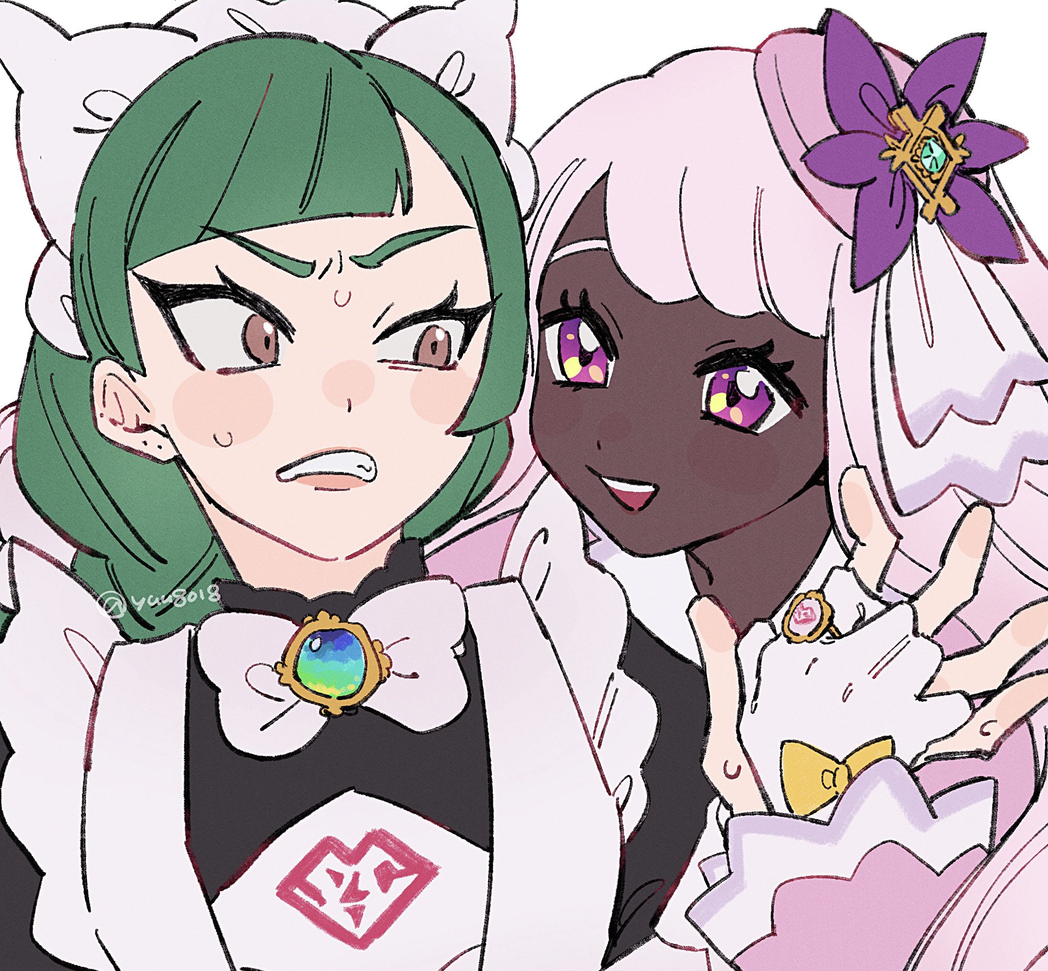 2girls apron bow bowtie braid braided_ponytail brooch brown_eyes clenched_teeth dark-skinned_female dark_skin dress eye_contact fascinator frown gem glove_bow gloves green_hair hair_ornament hand_up highres holding_hands jacinthe_(pokemon) jewelry lebanne_(pokemon) long_hair long_sleeves looking_at_another looking_to_the_side maid_apron maid_headdress master_and_servant multiple_girls nervous nervous_sweating nintendo open_mouth pokemon pokemon_legends:_z-a purple_dress purple_eyes purple_hair sweat sweatdrop teeth upper_body v-shaped_eyebrows very_dark_skin white_bow white_bowtie white_gloves yellow_bow yuri yuu_(yuuka_8018)