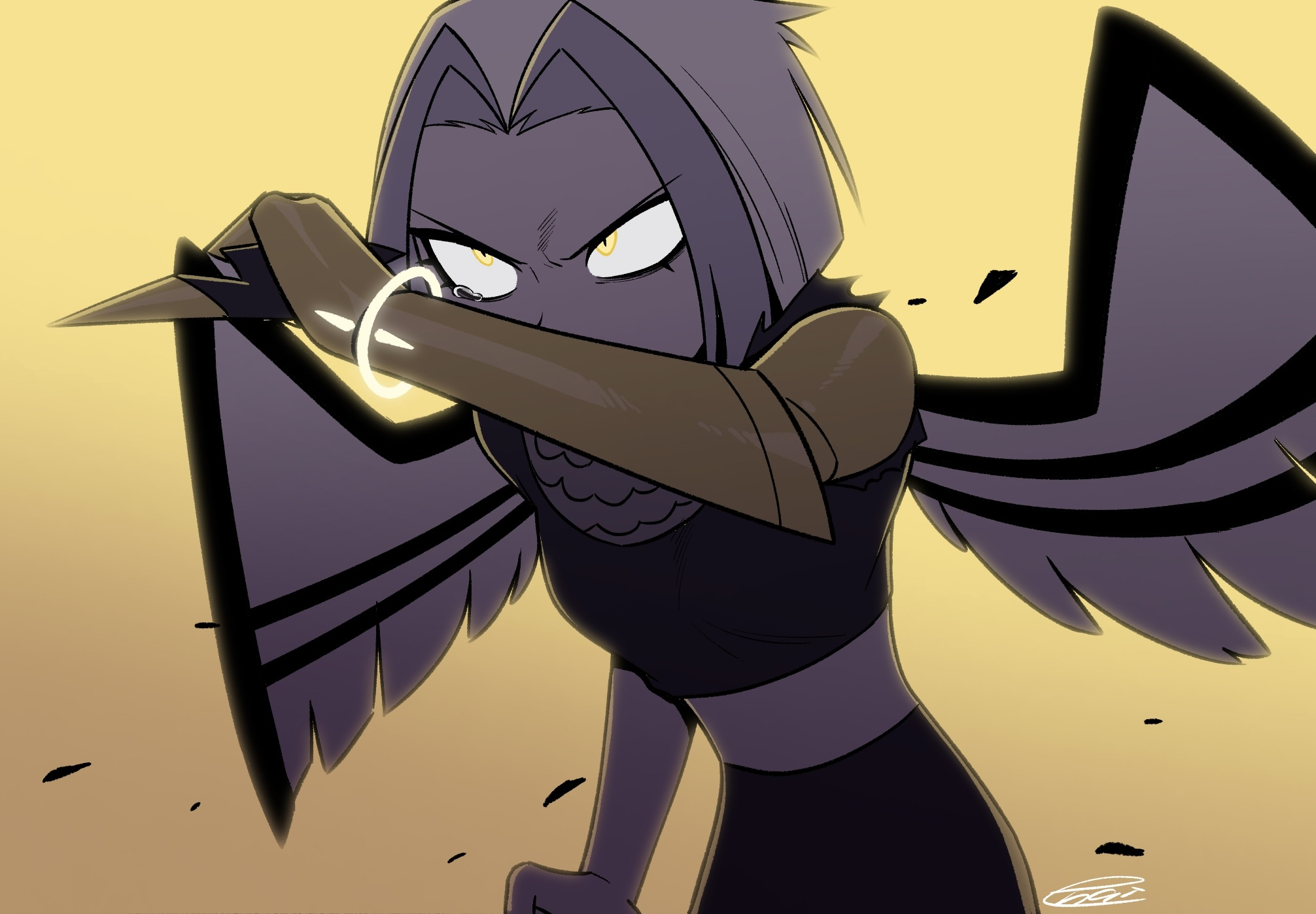 1girl angry arm_at_side backlighting belt black_dress black_wings bob_cut bracelet breasts commentary_request covered_mouth cowboy_shot curtained_hair dress elbow_gloves glass_shard glass_shards gloves glowing glowing_eyes grey_hair hand_up hazbin_hotel hellaverse highres holding_glass_shard jewelry looking_ahead lute_(hazbin_hotel) mechanical_arms menma_(enaic31) short_hair signature simple_background single_elbow_glove single_glove single_mechanical_arm small_breasts solo standing tearing_up two-tone_wings v-shaped_eyebrows white_belt white_gloves white_hair white_wings wings yellow_background yellow_eyes