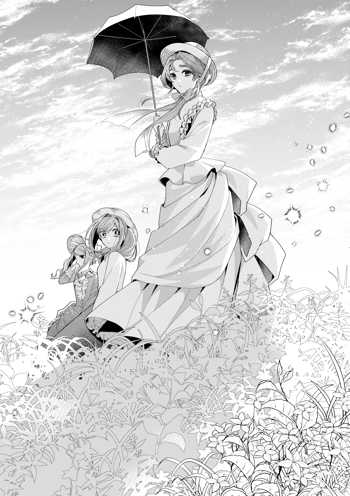 3girls alexandra_cecily breasts commentary_request diana_(akutsuka) dress flower genkai_ol-san_wa_akuyaku_reijou-sama_ni_tsukaetai greyscale hair_ornament hat highres holding holding_umbrella jewelry long_hair long_sleeves looking_at_viewer monochrome multiple_girls natori_midori shinonome_neko-tarou skirt umbrella