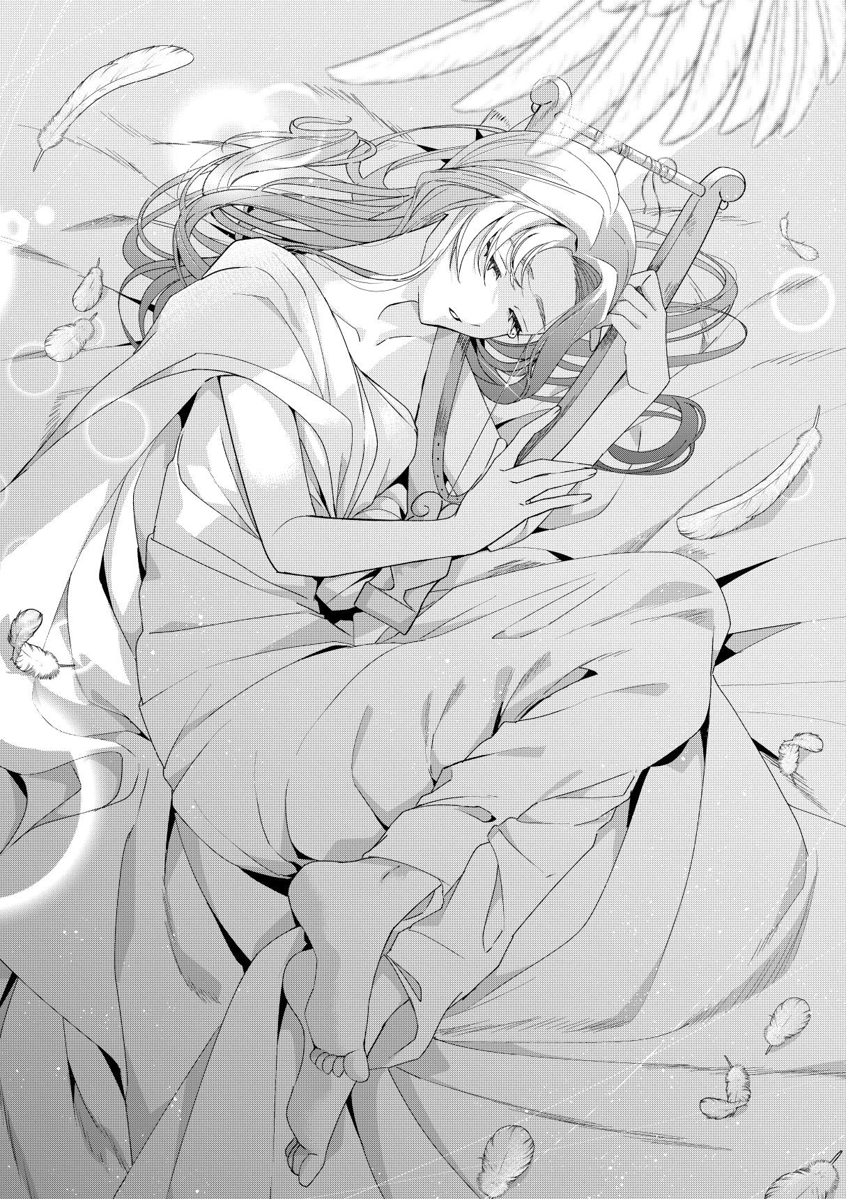 1girl barefoot breasts commentary_request dress falling_feathers feathered_wings feathers genkai_ol-san_wa_akuyaku_reijou-sama_ni_tsukaetai greyscale highres holding holding_instrument holding_lyre instrument long_hair lyre monochrome natori_midori plume shinonome_neko-tarou sleeping solo tunic wings