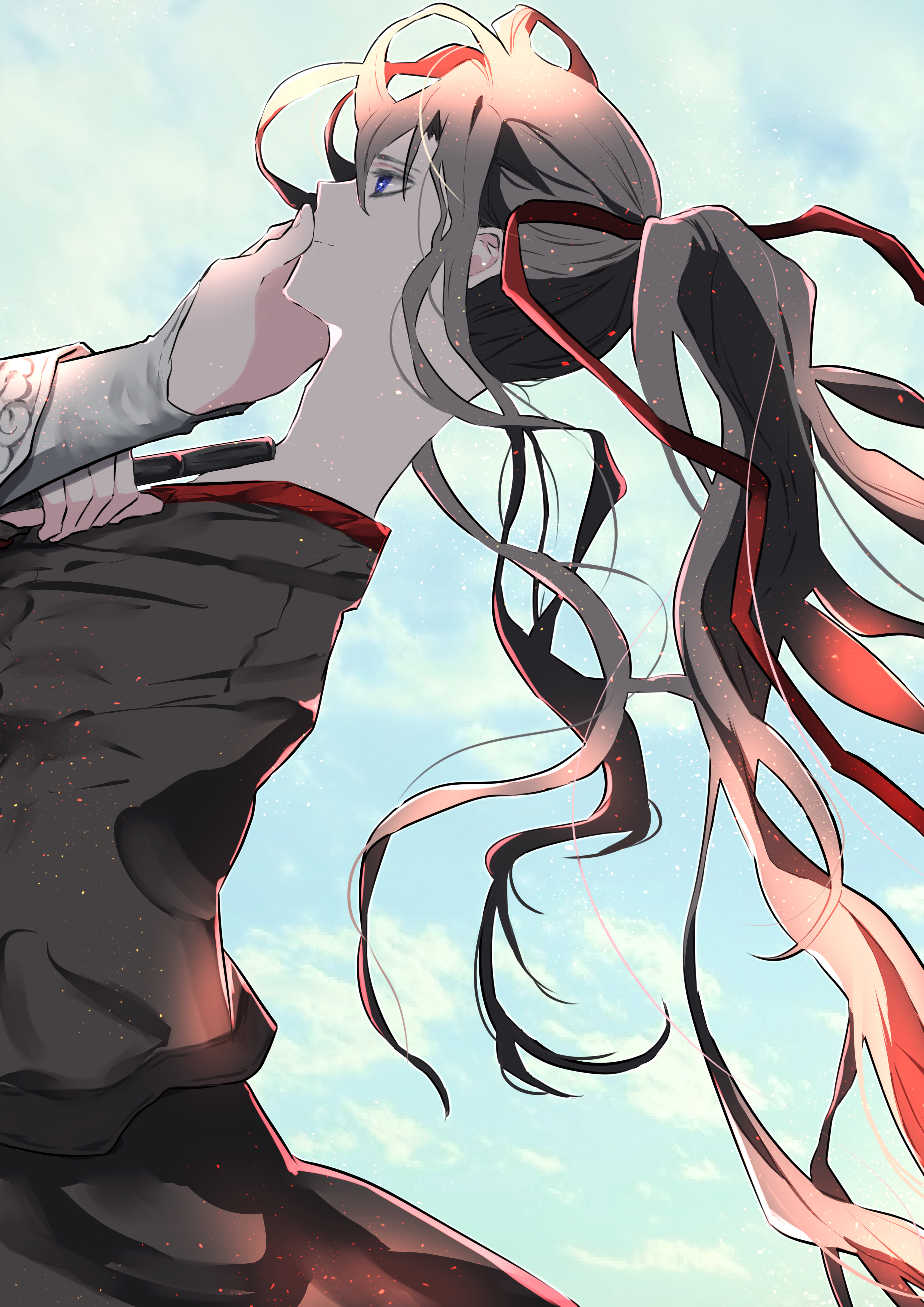 2boys absurdres black_hair black_hanfu chenqing_flute chinese_clothes closed_mouth cloud dizi floating_hair flute from_side hair_ribbon hand_on_another's_chin hand_on_another's_face hanfu highres holding holding_flute holding_instrument instrument lan_wangji light_particles long_hair long_sleeves male_focus modao_zushi multiple_boys naruse_(kmk648) out_of_frame ponytail profile purple_eyes red_ribbon ribbon robe sidelocks sky smile solo_focus transverse_flute very_long_hair wei_wuxian white_hanfu wide_sleeves yaoi