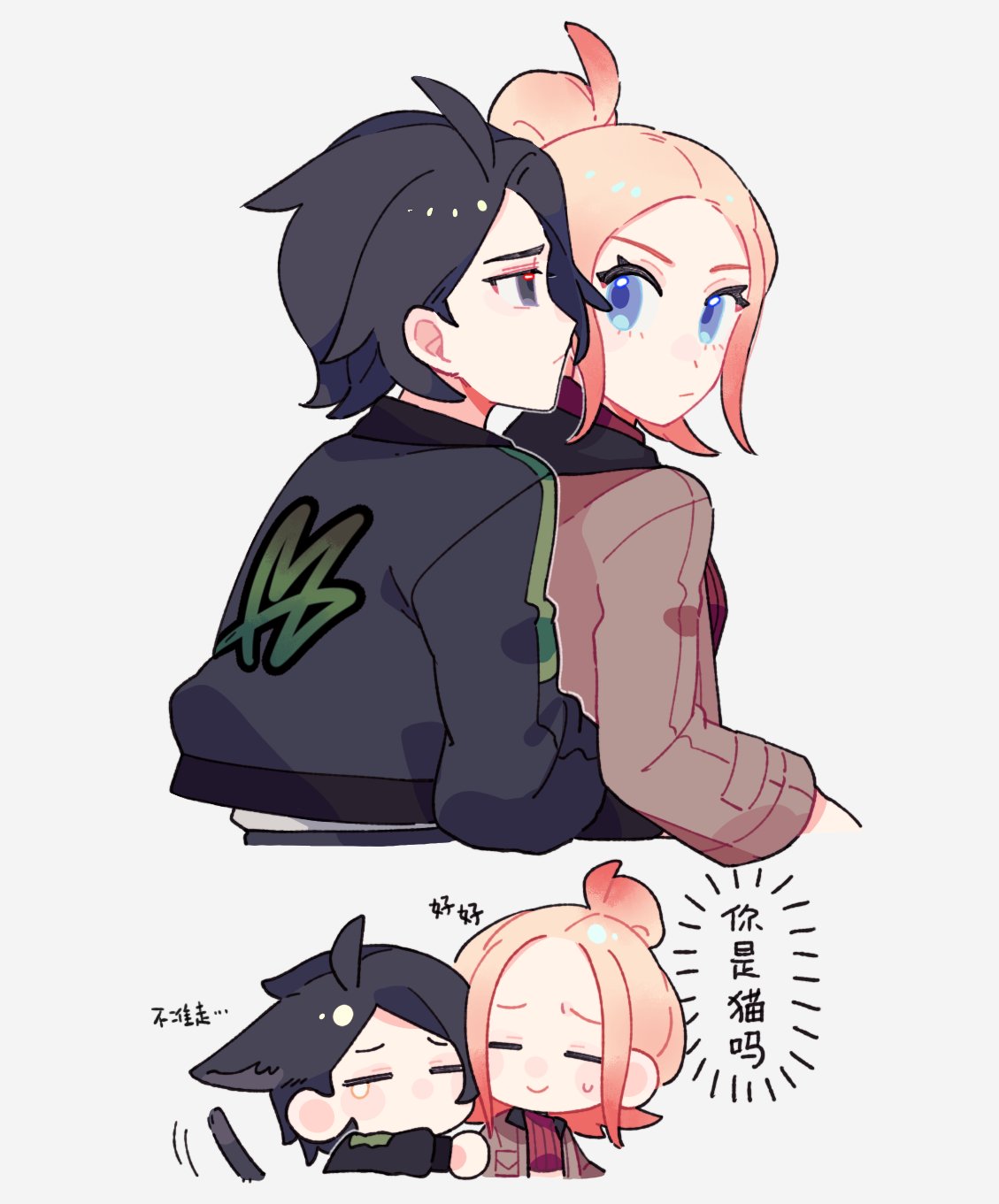 1boy 1girl ahoge animal_ears black_hair black_jacket blonde_hair blue_eyes brown_jacket chibi closed_mouth commentary_request eyelashes hair_bun highres hug hug_from_behind jacket jiugong_chi long_sleeves multiple_views nintendo paxton_(pokemon) pokemon pokemon_legends:_z-a red_shirt ribbed_shirt shirt short_hair smile sweatdrop tail taunie_(pokemon)