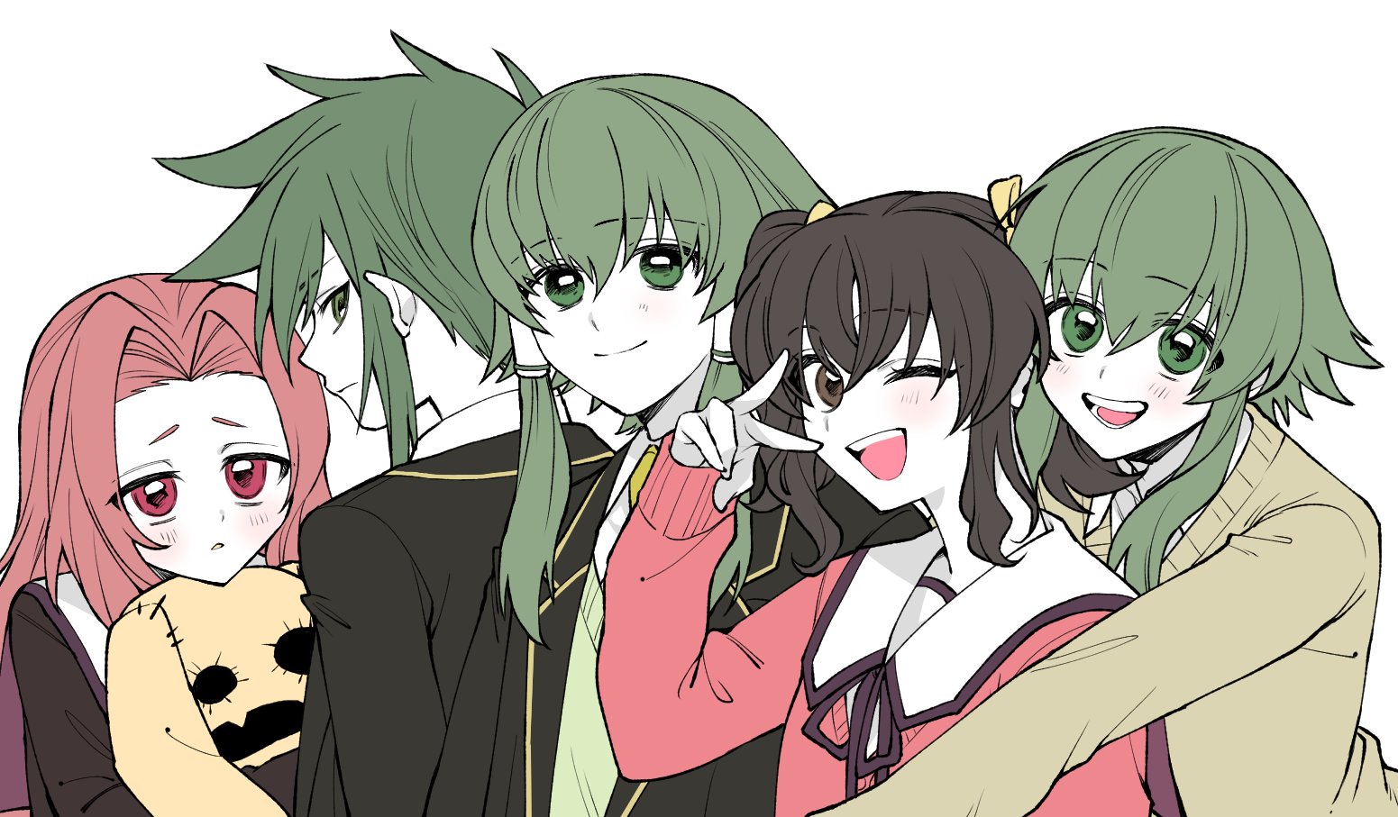 2boys 2girls alternate_costume anise_tatlin arietta_(tales) black_hair black_jacket blush commentary_request contemporary green_hair hair_ribbon igarashi_(morimorienoki) ion_(tales) jacket long_hair looking_at_viewer multiple_boys multiple_girls one_eye_closed open_clothes open_jacket open_mouth pale_skin parted_bangs pink_hair pink_sweater ribbon school_uniform short_hair short_hair_with_long_locks sidelocks smile stuffed_toy sweater sweater_vest sync_(tales) tales_of_(series) tales_of_the_abyss twintails upper_body v white_background yellow_ribbon