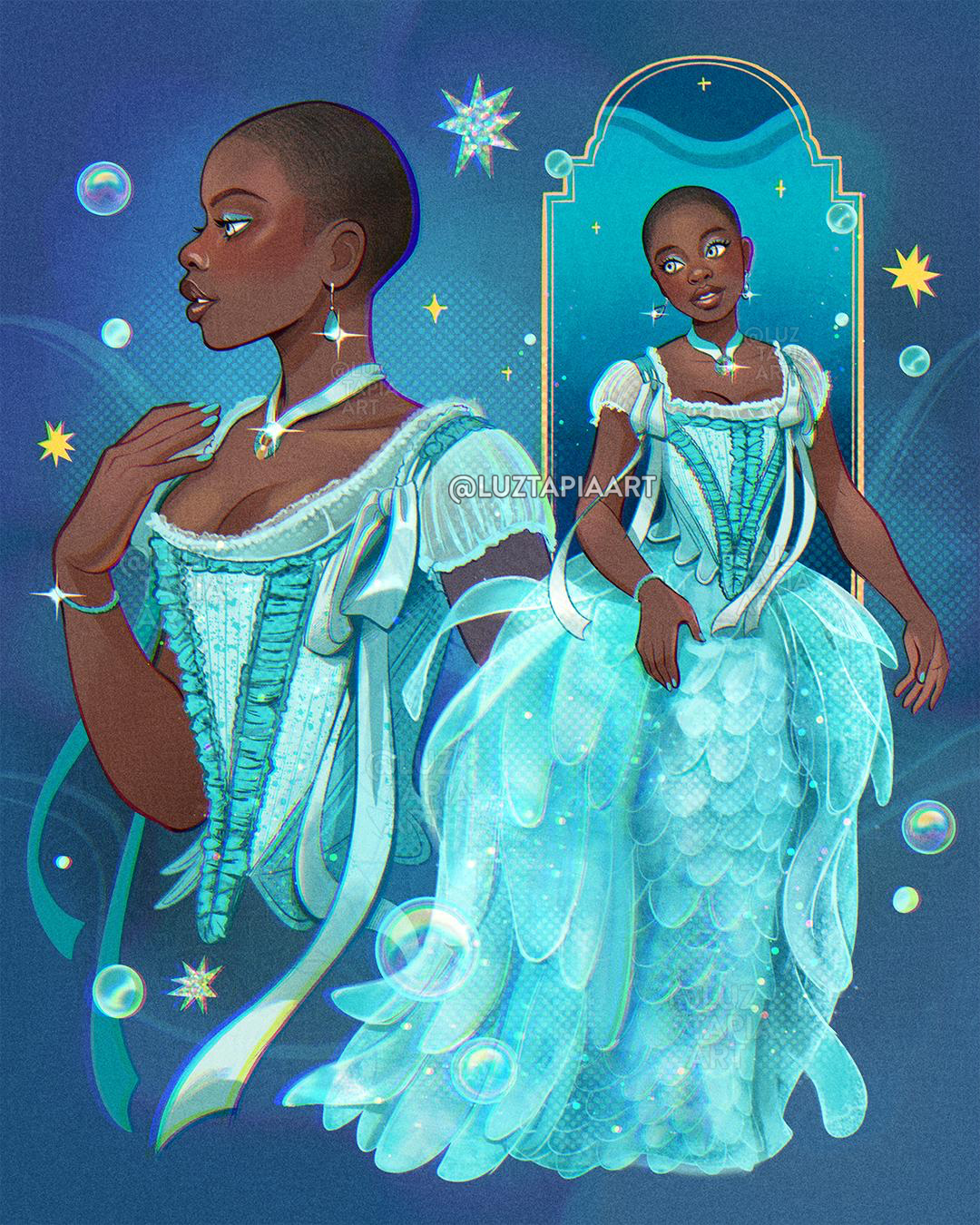 1girl artist_name bald bald_female bianca_barclay black_hair blue_dress blue_eyes blue_eyeshadow bubble dark-skinned_female dark_skin dress eyeshadow highres luztapiaart makeup multiple_views the_addams_family very_dark_skin watermark wednesday_(netflix)