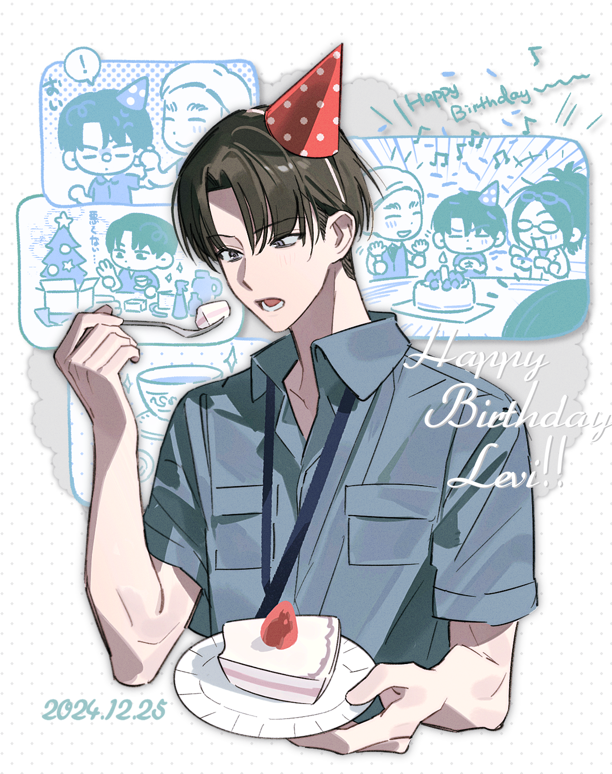 1boy birthday black_hair blue_shirt cake cake_slice chibi chibi_inset collared_shirt dated eating evodtonaeco food fork fruit happy_birthday hat highres holding holding_fork levi_(shingeki_no_kyojin) male_focus multiple_boys open_mouth party_hat plate red_hat shingeki_no_kyojin shirt short_hair strawberry upper_body