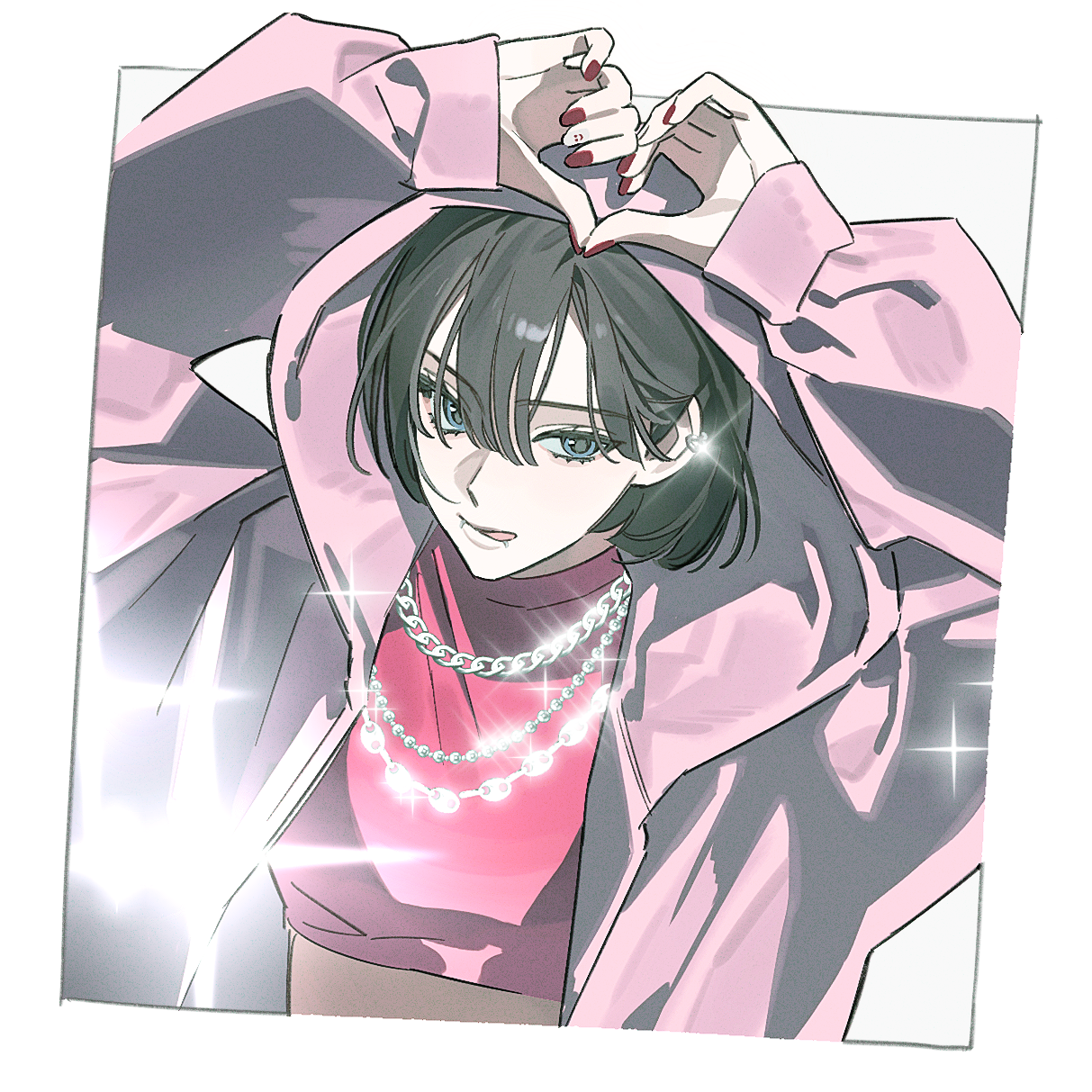 1girl arms_up black_hair blue_eyes border chain chain_necklace crop_top evodtonaeco hair_between_eyes heart heart_hands highres hood hooded_jacket jacket jewelry long_sleeves looking_at_viewer nail_polish necklace open_clothes open_jacket original pink_jacket pink_shirt red_nails shirt short_hair solo sparkle tongue upper_body