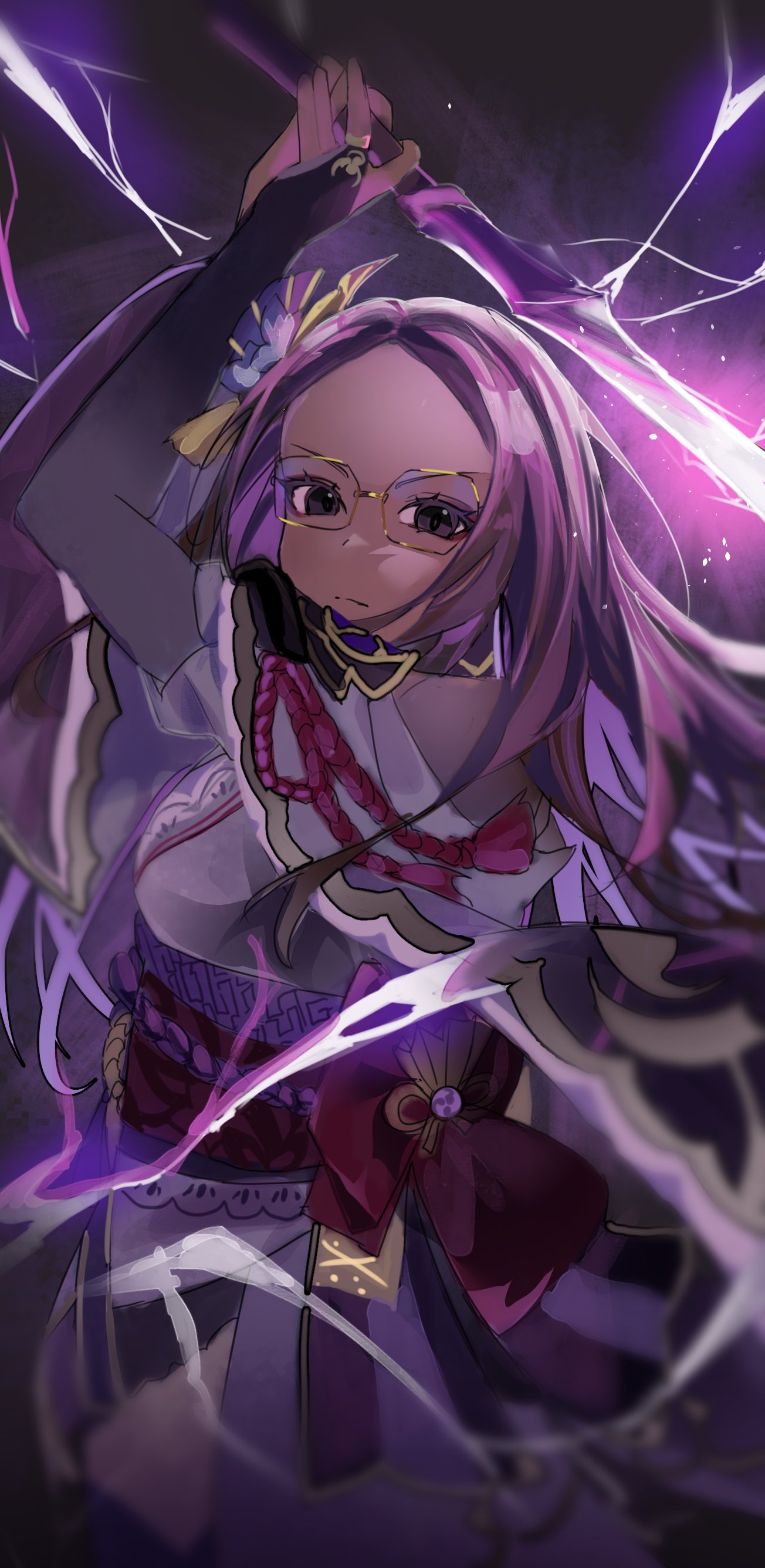 1girl absurdres animification anne_yatco arms_up blurry blurry_background blurry_foreground blush breasts bridal_gauntlets brown_eyes closed_mouth commentary cosplay cowboy_shot english_commentary fan_hair_ornament floating_clothes flower genshin_impact glasses hair_ornament highres holding holding_sword holding_weapon japanese_clothes kanako_(fuwachu) kimono light_frown light_particles lightning long_hair long_sleeves looking_at_viewer musou_isshin_(genshin_impact) obiage obijime purple_eyes purple_flower purple_hair purple_kimono raiden_shogun raiden_shogun_(cosplay) real_life sash serious simple_background solo sword tan voice_actor voice_actor_connection weapon