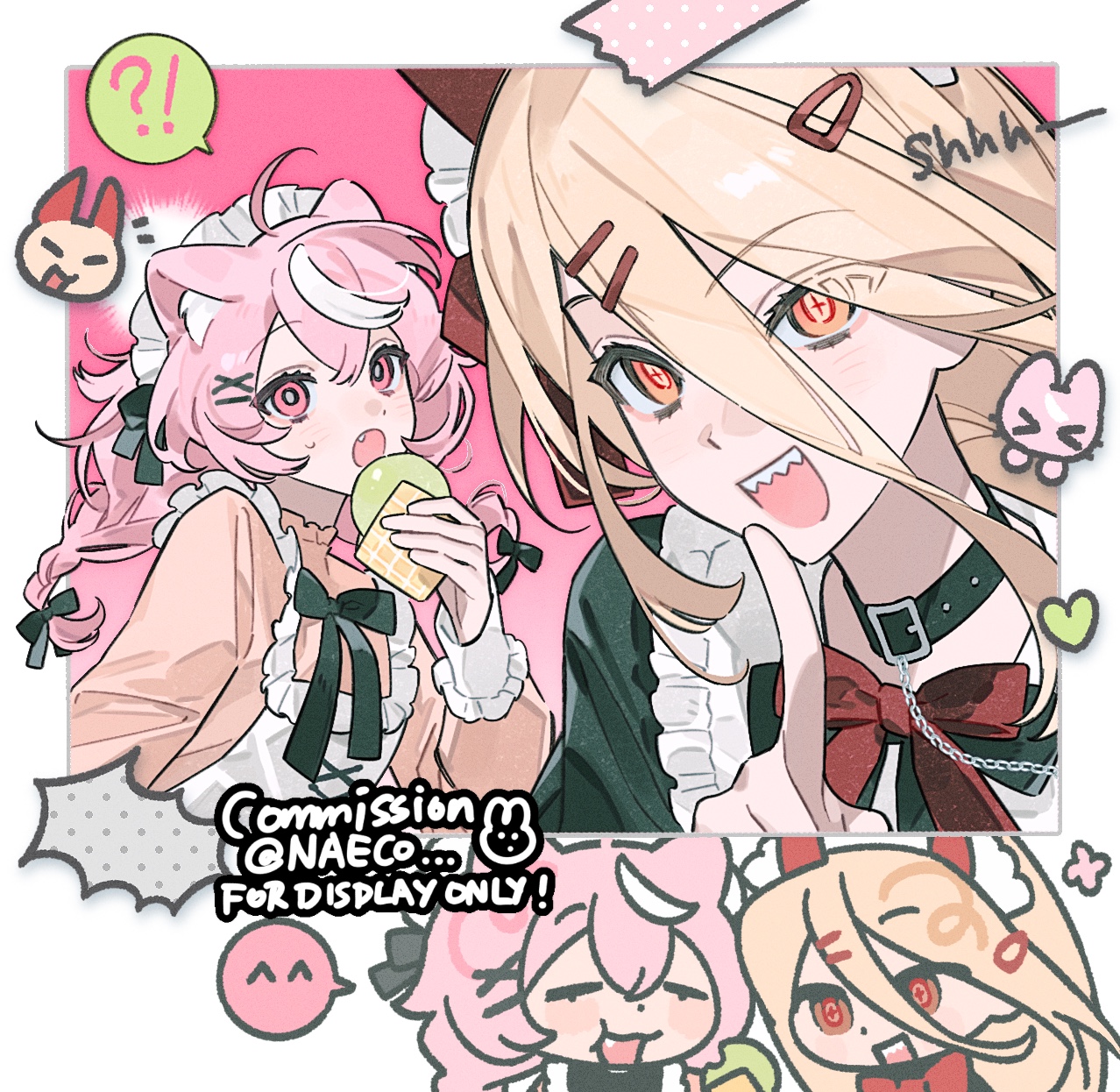 ! 2girls animal_ears apron blonde_hair bow bowtie cat_ears cat_girl chainsaw_man chibi chibi_inset collar commentary_request cross-shaped_pupils demon_girl demon_horns evodtonaeco food hair_between_eyes hair_ornament hairclip highres holding holding_food horns long_hair looking_at_viewer maid maid_apron maid_headdress multiple_girls open_mouth pink_eyes pink_hair power_(chainsaw_man) red_bow sharp_teeth smile symbol-shaped_pupils teeth