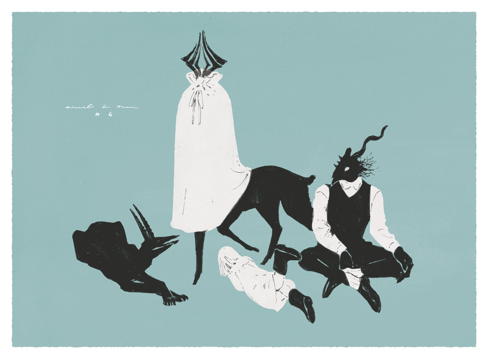 1boy 1girl blue_background body_fur child creature deer dress full_body furry furry_male greyscale_with_colored_background horns indian_style lying nagabe on_stomach sensei_(totsukuni_no_shoujo) shiva_(totsukuni_no_shoujo) simple_background sitting tail totsukuni_no_shoujo vest