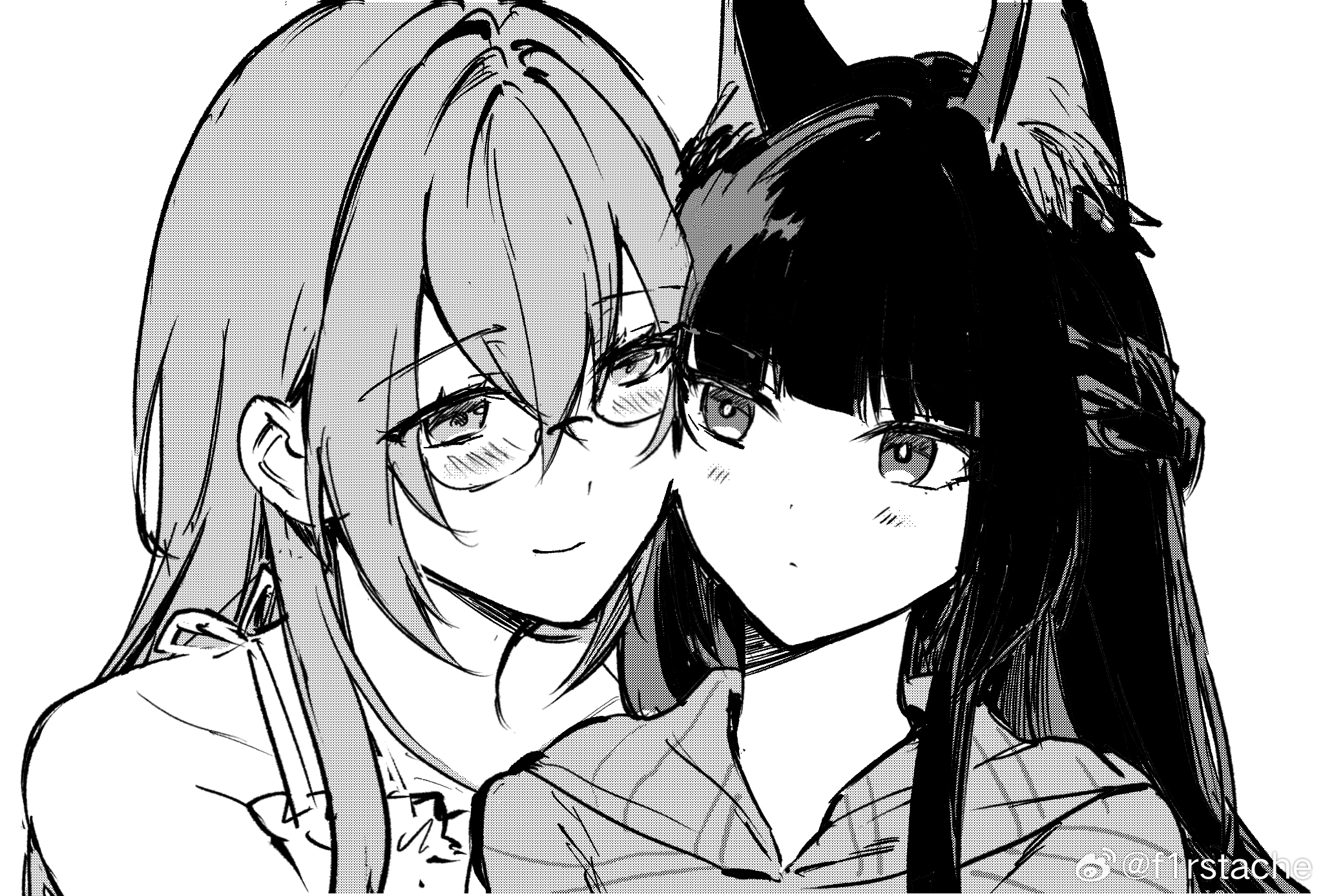 2girls animal_ear_fluff animal_ears bad_link bad_weibo_link blunt_bangs blush closed_mouth f1rstache fox_ears fox_girl glasses greyscale highres hoshimi_miyabi long_hair looking_at_another monochrome multiple_girls sidelocks simple_background smile tsukishiro_yanagi upper_body watermark weibo_watermark white_background yuri zenless_zone_zero