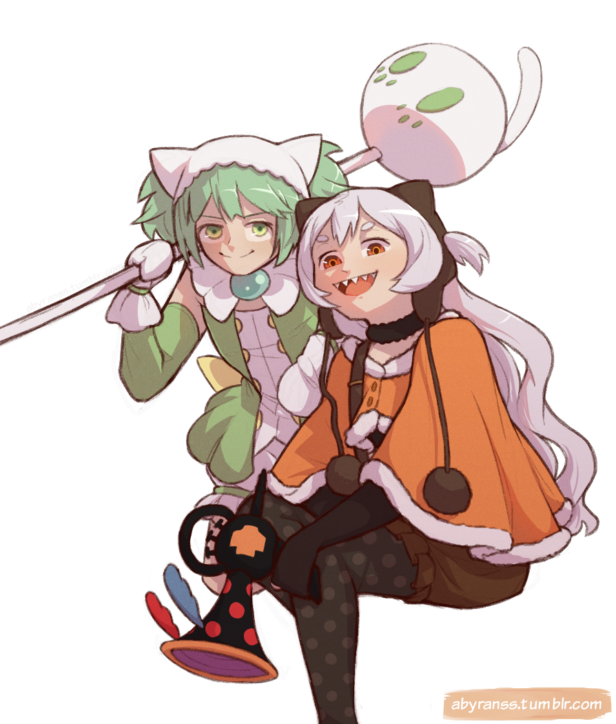2girls abyranss animal_hat bare_shoulders black_gloves black_pantyhose brown_skirt bubble_skirt capelet child chitose_yuma commentary english_commentary fingerless_gloves fur-trimmed_capelet fur_trim gloves green_eyes green_hair gun hat holding holding_gun holding_staff holding_weapon long_hair magical_girl mahou_shoujo_madoka_magica mahou_shoujo_madoka_magica:_hangyaku_no_monogatari mahou_shoujo_madoka_magica_(anime) mahou_shoujo_oriko_magica medium_hair mittens momoe_nagisa momoe_nagisa_(magical_girl) multiple_girls open_mouth orange_capelet pantyhose polka_dot polka_dot_pantyhose red_eyes ringed_eyes sharp_teeth short_twintails simple_background skirt staff teeth thick_eyebrows tongue tumblr_username twintails upper_teeth_only watermark weapon white_background white_hair white_mittens