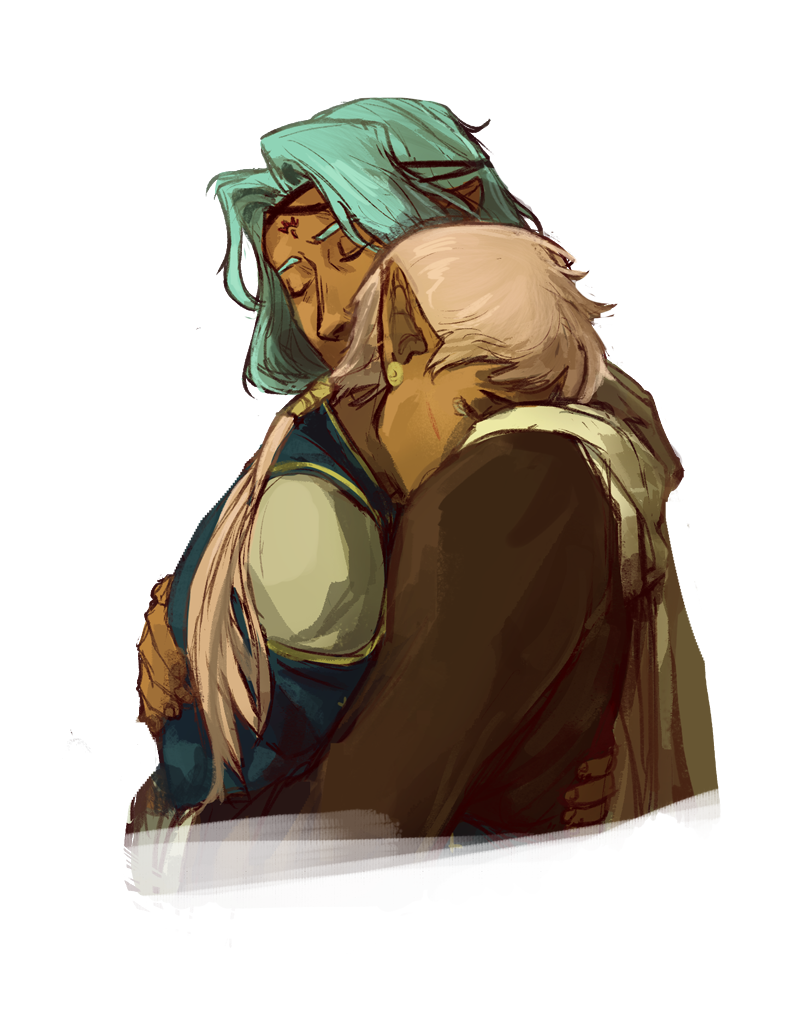 1boy 1girl blue_hair closed_eyes commentary_request cropped_torso dark-skinned_female dark-skinned_male dark_skin ena_(fire_emblem) facial_mark fire_emblem fire_emblem:_path_of_radiance forehead_mark grandfather_and_granddaughter hug long_hair nasir_(fire_emblem) nintendo pink_hair pointy_ears ponytail sahrnia