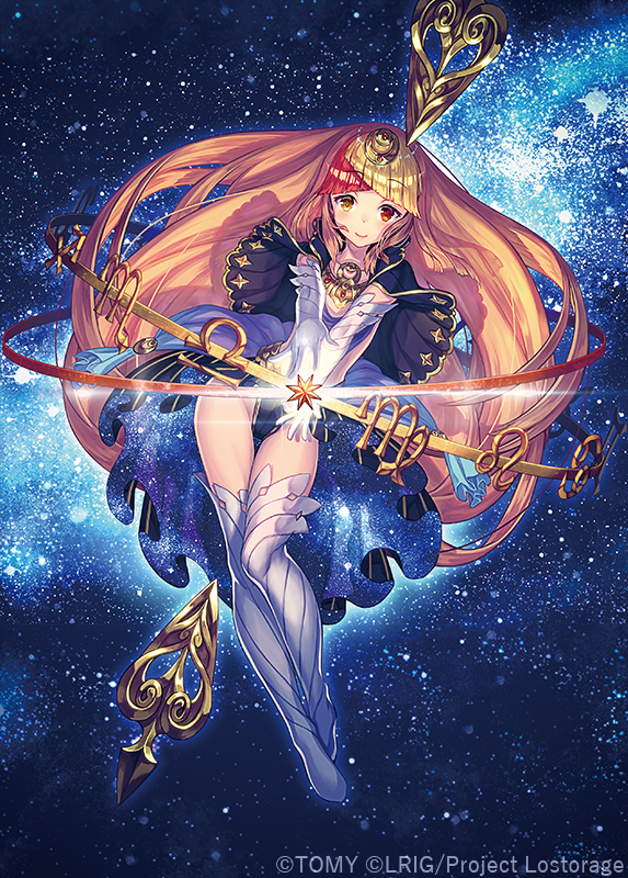 1girl blue_dress boots closed_mouth copyright_notice dress equinox_(wixoss) gloves heterochromia kutori_pan'ya long_hair looking_at_viewer multicolored_hair official_art orange_eyes orange_hair red_hair sky smile solo space star_(sky) starry_sky streaked_hair very_long_hair white_background white_boots white_gloves wixoss yellow_eyes