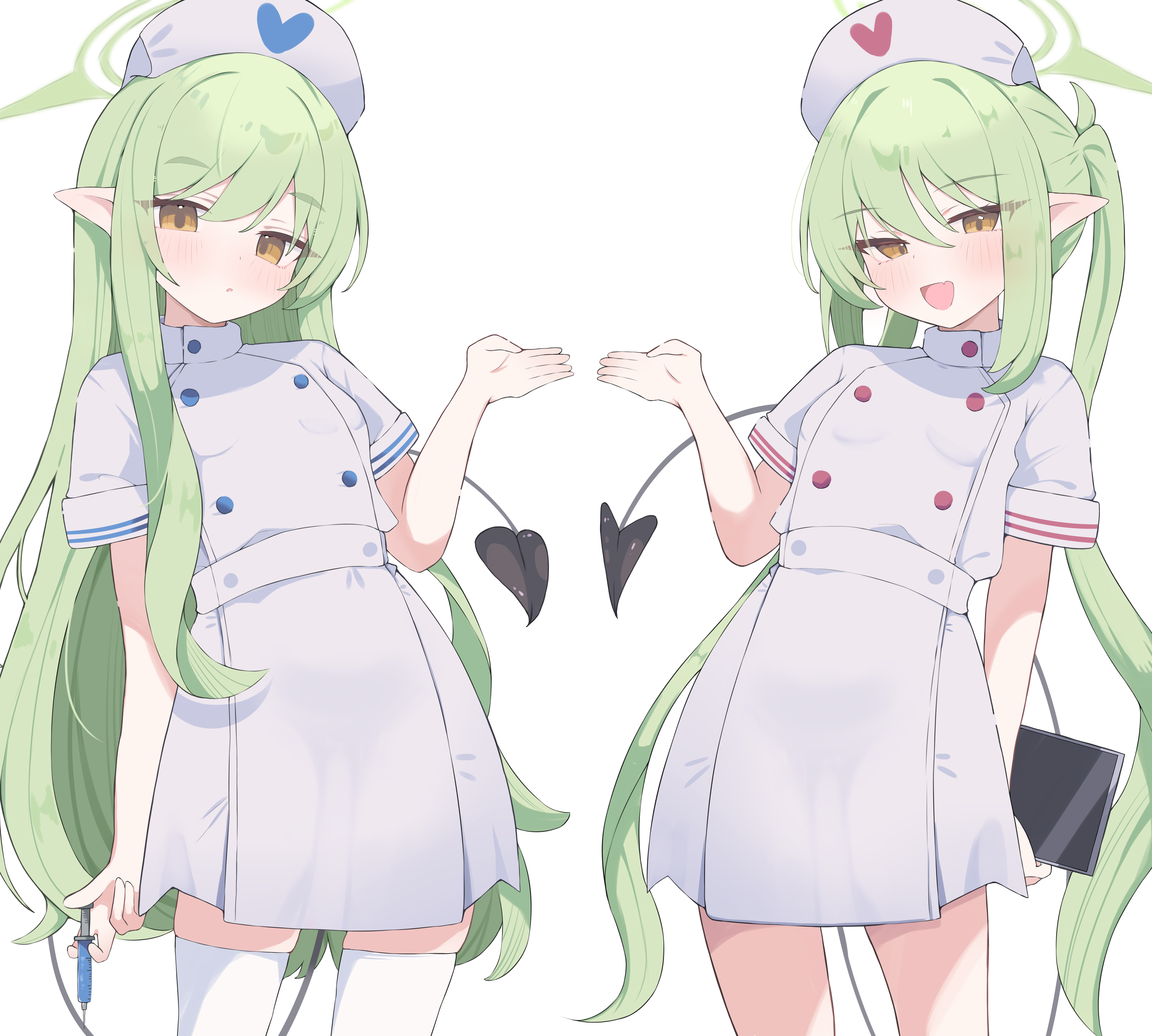 2girls :d :o absurdres black_tail blue_archive brown_eyes cowboy_shot demon_girl demon_tail dress green_hair green_halo halo hat highres hikari_(blue_archive) holding holding_syringe long_hair looking_at_viewer multiple_girls nozomi_(blue_archive) nui_(nuinui0300) nurse nurse_cap open_mouth pointy_ears short_sleeves siblings simple_background sisters smile syringe tail thighhighs translation_request twins twintails very_long_hair white_background white_dress white_thighhighs