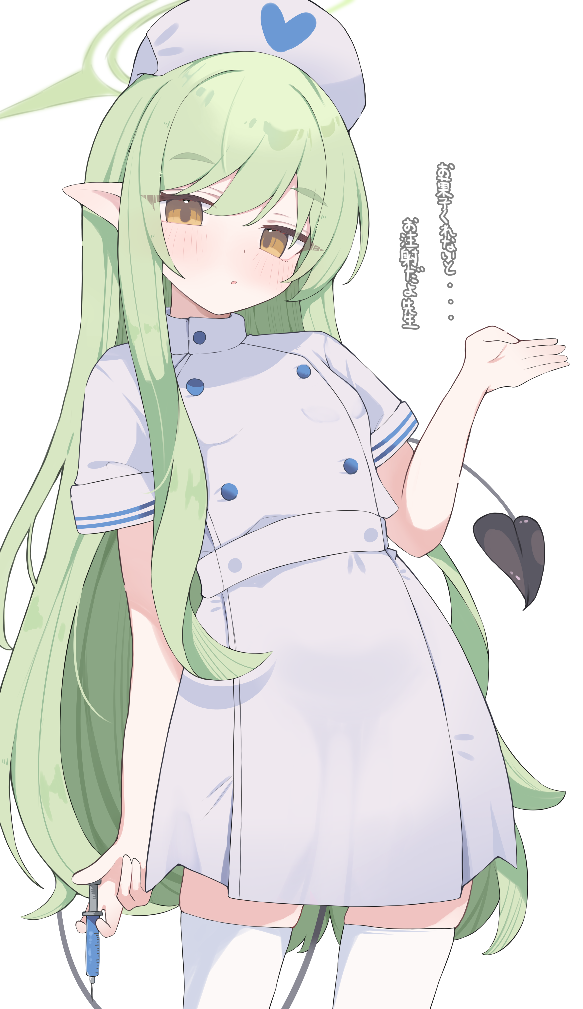 1girl :o absurdres black_tail blue_archive brown_eyes cowboy_shot demon_girl demon_tail dress green_hair green_halo halo hat highres hikari_(blue_archive) holding holding_syringe long_hair looking_at_viewer nui_(nuinui0300) nurse nurse_cap open_mouth pointy_ears short_sleeves simple_background solo syringe tail thighhighs translation_request very_long_hair white_background white_dress white_thighhighs