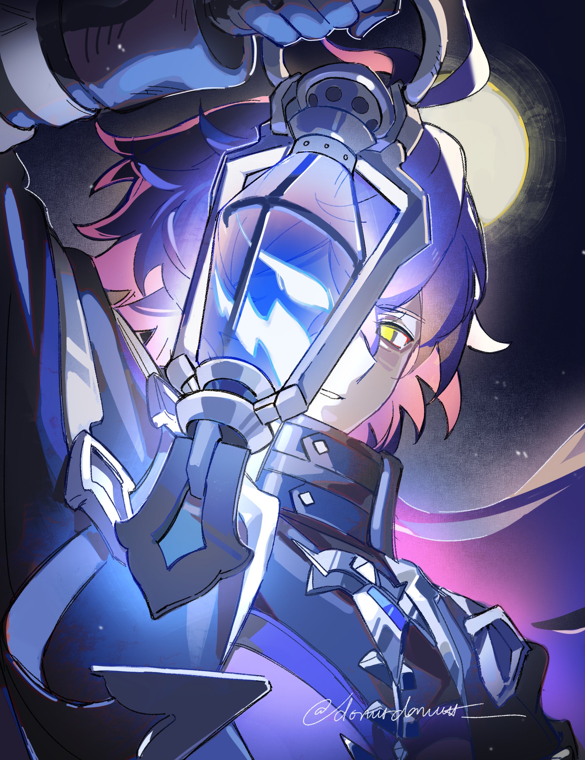 1boy absurdres arm_up black_jacket blue_gem blue_hair collared_jacket commentary donutdonutt english_commentary flins_(genshin_impact) floating_hair full_moon gem genshin_impact gloves glowing glowing_eye highres holding holding_lantern jacket lantern long_hair long_sleeves male_focus moon night sky sleeve_cuffs smile solo upper_body very_long_hair yellow_eyes
