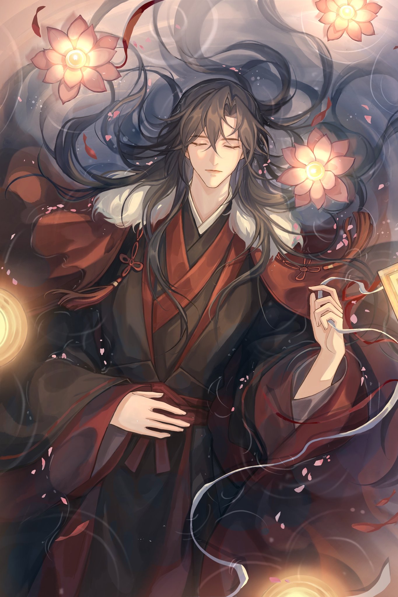 1boy afloat alternate_hairstyle bishounen black_hair black_hanfu chinese_clothes chinese_knot cloak closed_eyes closed_mouth facing_viewer flower from_above fur-trimmed_cloak fur_trim hair_between_eyes hair_down hair_ribbon hair_spread_out hanfu highres holding holding_ribbon implied_yaoi lantern long_hair long_sleeves lotus lying male_focus modao_zushi on_back partially_submerged petals petals_on_liquid pink_flower pink_petals red_cloak red_ribbon red_sash ribbon robe sash solo tassel untied_ribbon very_long_hair water wei_wuxian wei_wuxian_(yiling_laozu) white_ribbon wide_sleeves winter_clothes ymggklk0810