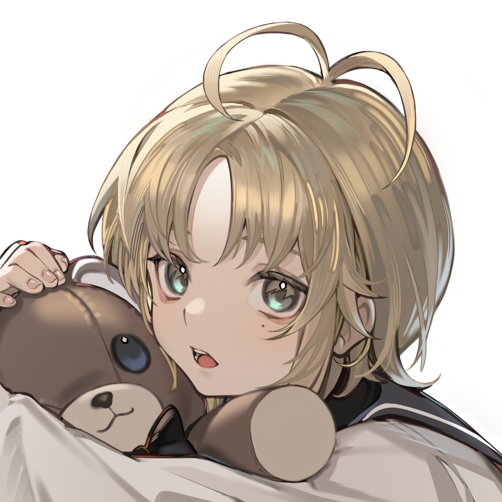 1boy :o antenna_hair aqua_eyes black_sailor_collar blonde_hair child chinese_commentary fingernails freeze_(867139) from_side holding holding_stuffed_toy hugging_object long_sleeves looking_at_viewer male_focus mole mole_under_eye open_mouth original parted_bangs portrait sailor_collar sailor_shirt shirt short_hair sideways_glance simple_background solo stuffed_animal stuffed_toy teddy_bear teeth white_background white_shirt