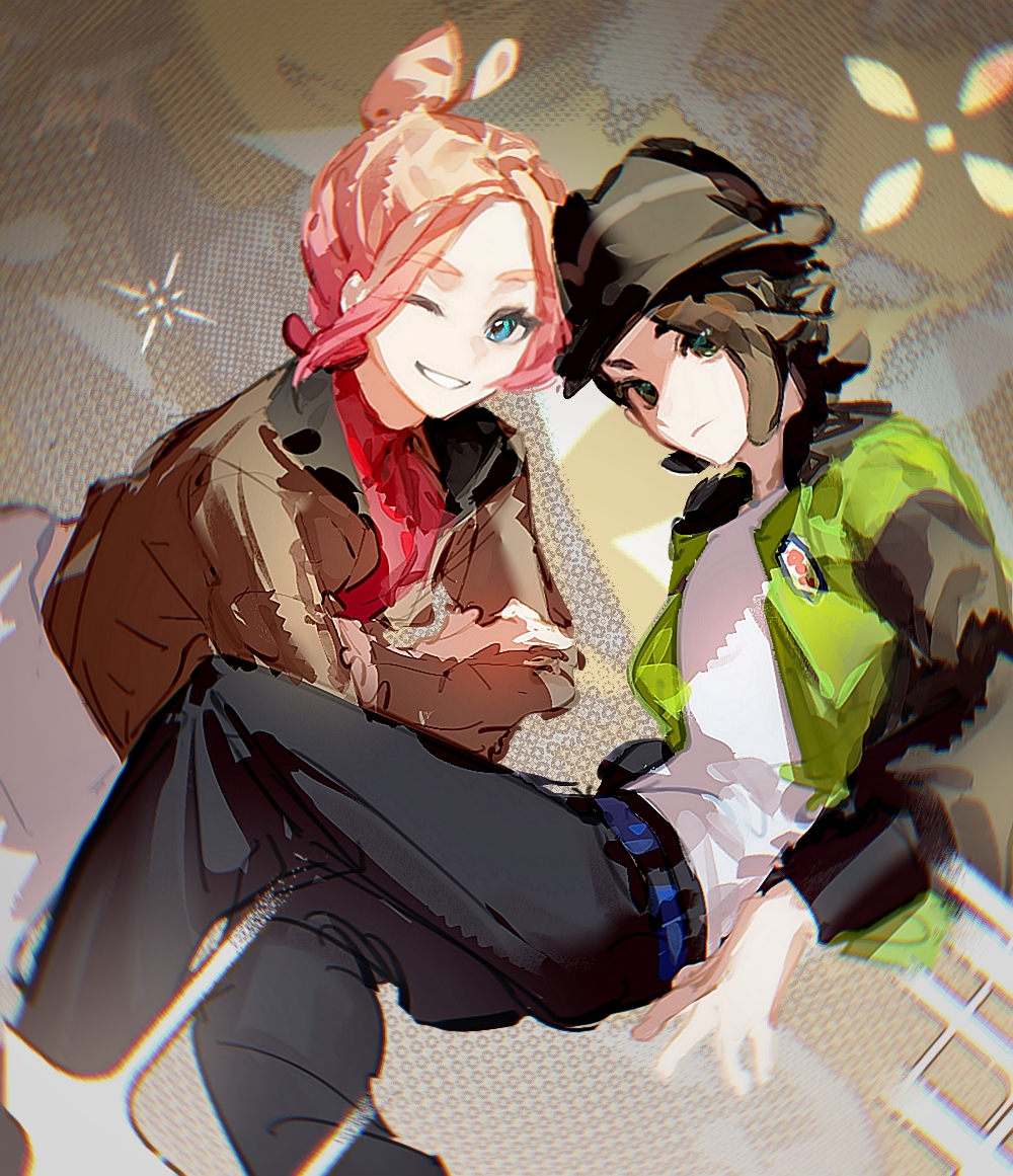 1boy 1girl belt black_eyes black_hair black_pants black_sleeves blonde_hair blue_belt blue_eyes brown_jacket chuanjianhuangjiuneglect crossed_legs expressionless fedora feet_out_of_frame gradient_hair green_jacket grin hat jacket looking_at_viewer multicolored_hair multicolored_jacket nintendo one_eye_closed pants paxton_(pokemon) pink_hair pokemon pokemon_legends:_z-a shirt short_hair smile taunie_(pokemon) turtleneck two-tone_jacket white_shirt