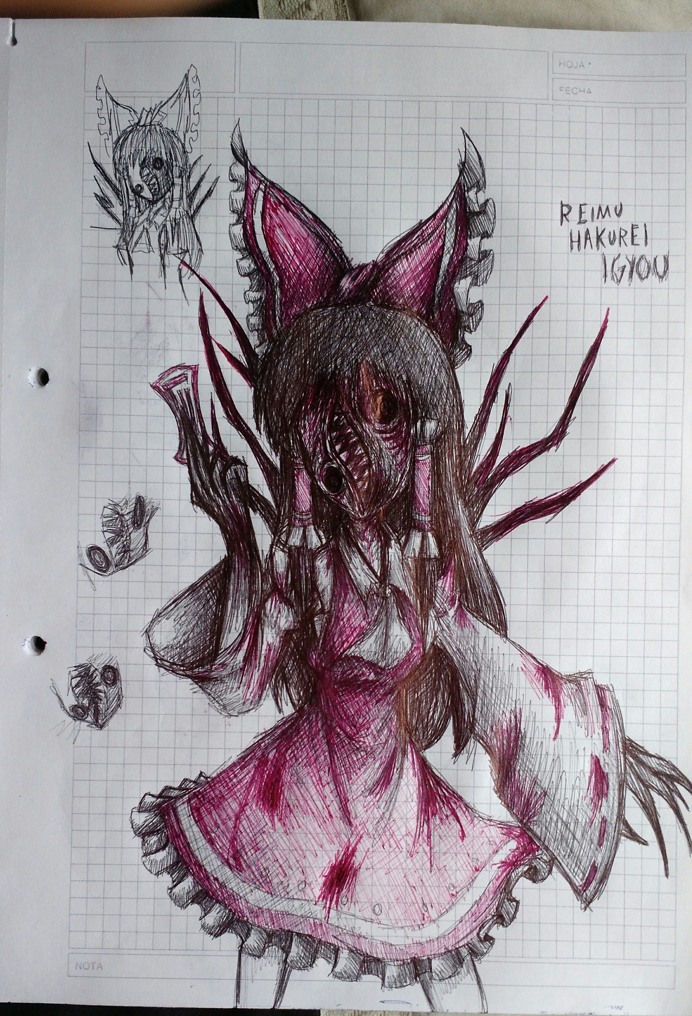 1girl arm_up ascot back_spikes between_fingers blood blood_on_clothes body_horror bow character_name claws commentary_request detached_sleeves frilled_bow frilled_hair_tubes frills hair_bow hair_tubes hakurei_reimu hatching_(texture) herushiart highres holding holding_ofuda hollow_eyes horror_(theme) limited_palette long_hair multiple_views ofuda ofuda_between_fingers red_skirt ribbon-trimmed_sleeves ribbon_trim skirt skirt_set solo spanish_commentary spines standing touhou touhou_igyoukyo traditional_media variant_reimu vertical_mouth yin_yang