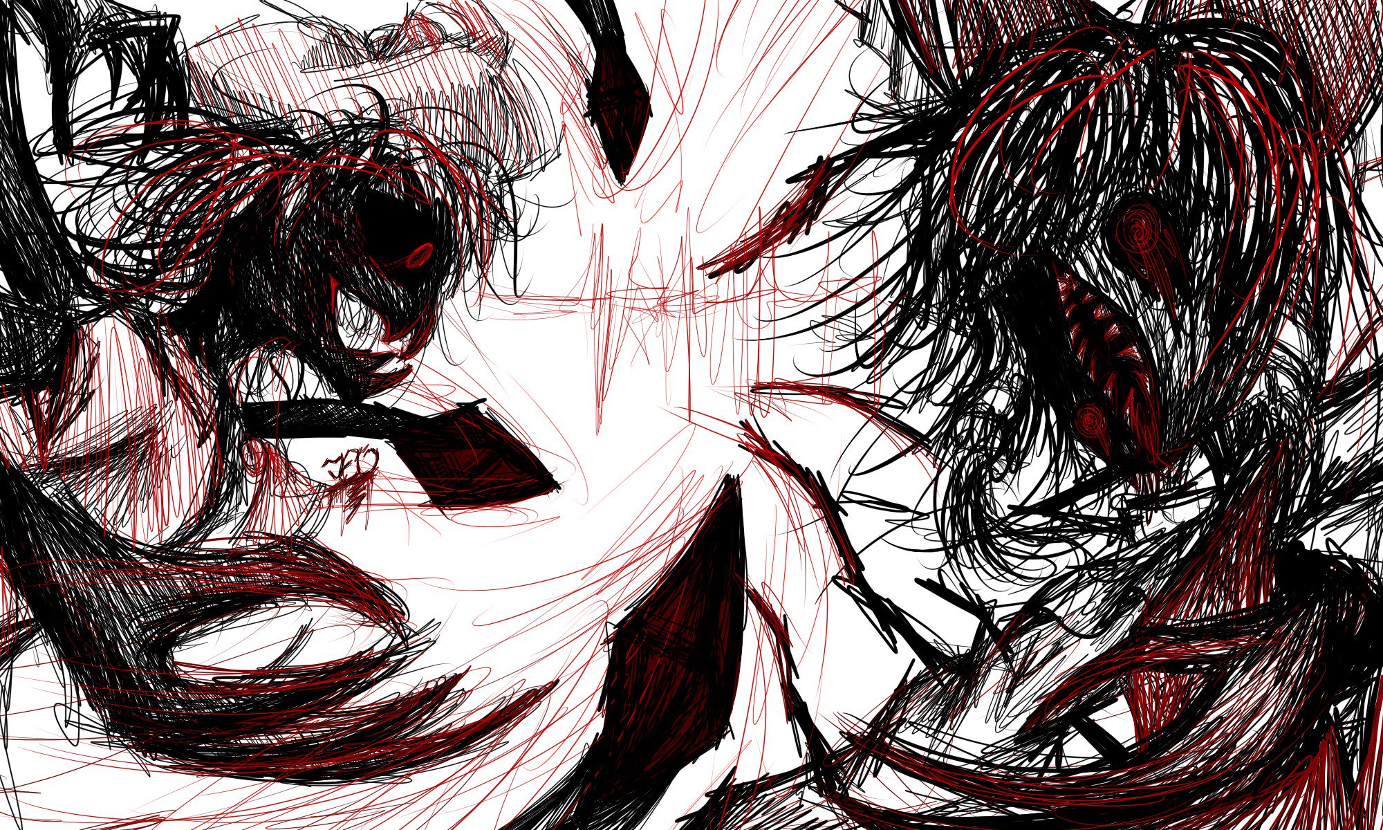 2girls ascot black_sclera black_skin blood blood_on_hands blood_on_teeth bow claws colored_sclera colored_skin commentary crystal detached_sleeves flandre_scarlet frilled_bow frilled_hair_tubes frills hair_bow hair_tubes hakurei_reimu hatching_(texture) herushiart highres hollow_eyes koishi_komeiji's_heart-throbbing_adventure limited_palette long_hair looking_at_another looking_down looking_up multiple_girls open_mouth red_bow red_eyes red_shirt red_skirt ribbon-trimmed_sleeves ribbon_trim sharp_teeth shirt skirt skirt_set space_kaiju spanish_commentary teeth touhou touhou_igyoukyo vampire-type_space_kaiju variant_reimu vertical_mouth yin_yang