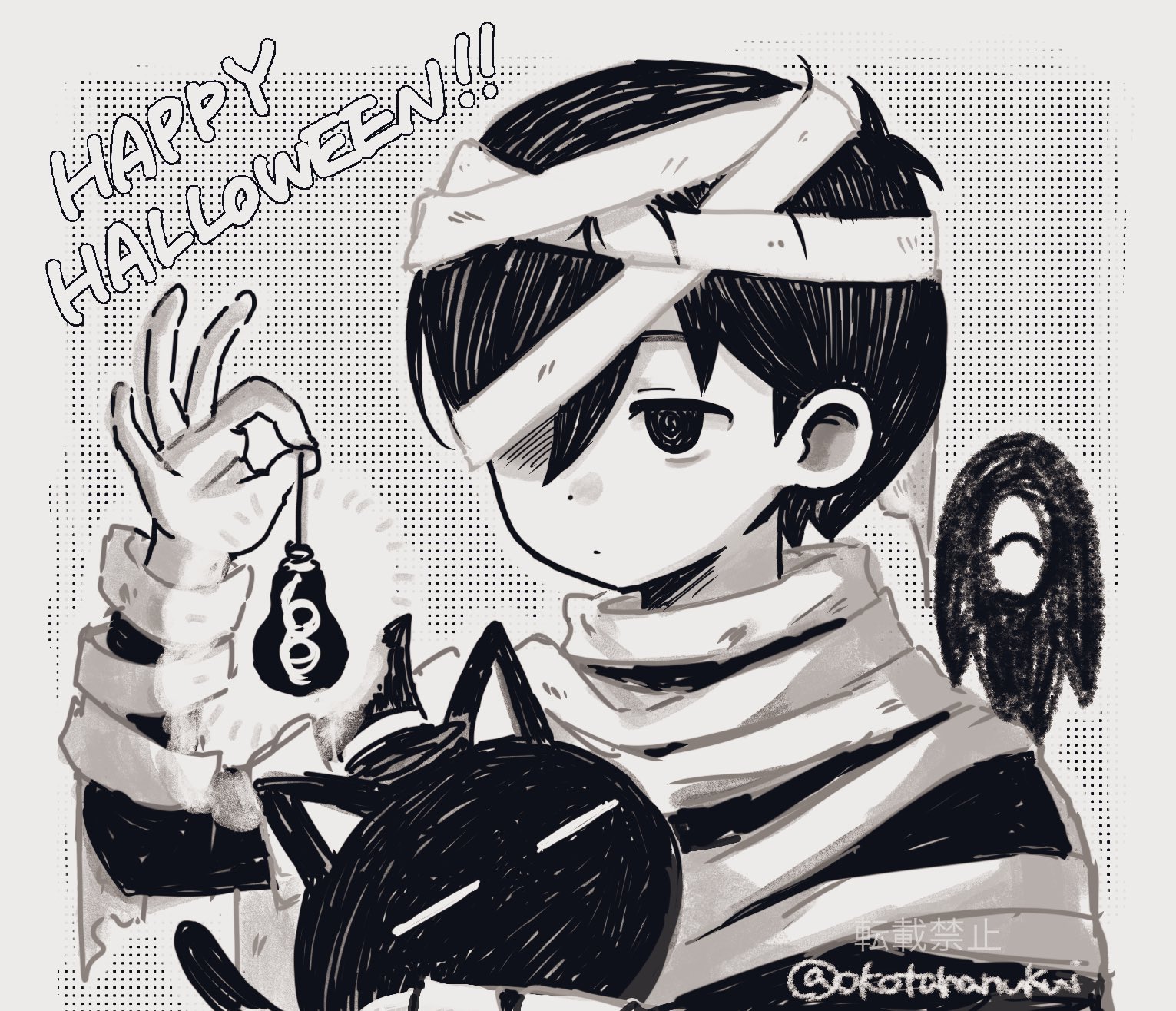 1boy animal antenna_hair artist_name black_eyes black_hair cat closed_mouth colored_skin double-parted_bangs expressionless hair_between_eyes happy_halloween highres holding holding_animal light_bulb male_focus mewo mummy_costume okotahanukui omori omori_(omori) short_hair solo something_(omori) twitter_username upper_body white_skin