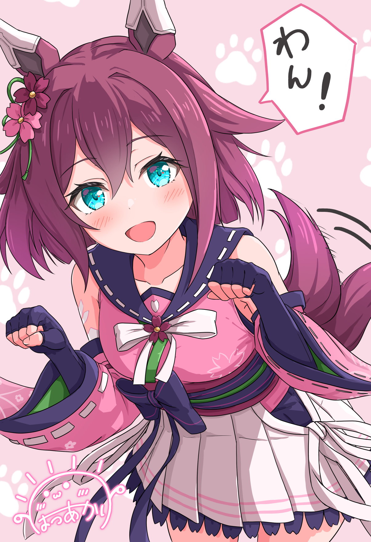 1girl animal_ears bare_shoulders blue_eyes blue_sailor_collar blush detached_sleeves gamyuu_(gamyu) hair_between_eyes highres horse_ears horse_girl horse_tail japanese_clothes kimono looking_at_viewer medium_hair open_mouth paw_pose pink_hair pink_kimono pleated_skirt sailor_collar sakura_chiyono_o_(strength_in_full_bloom)_(umamusume) sakura_chiyono_o_(umamusume) sidelocks skirt solo tail umamusume white_skirt