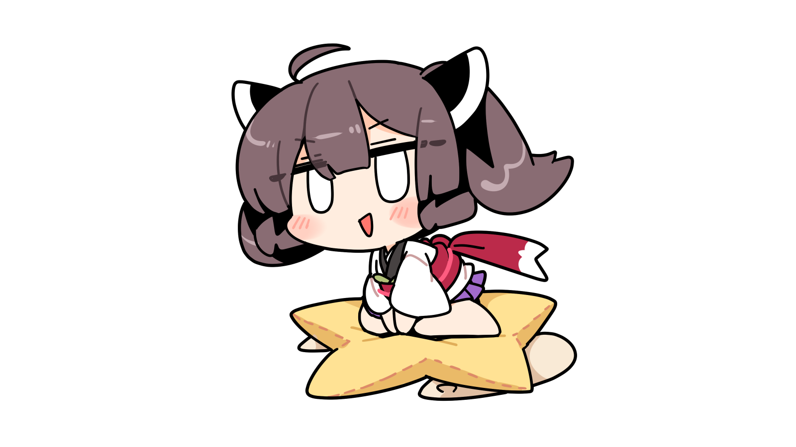 1girl :d ahoge barefoot blank_eyes blush_stickers brown_hair chibi chibi_only commentary_request double-parted_bangs full_body hair_between_eyes headgear highres ini_(inunabe00) japanese_clothes jitome kimono kiritanpo_(food) long_sleeves miniskirt obi open_mouth pillow pleated_skirt purple_skirt red_sash sash short_hair simple_background sitting skirt smile solo star_(symbol) touhoku_kiritan voiceroid white_background white_kimono