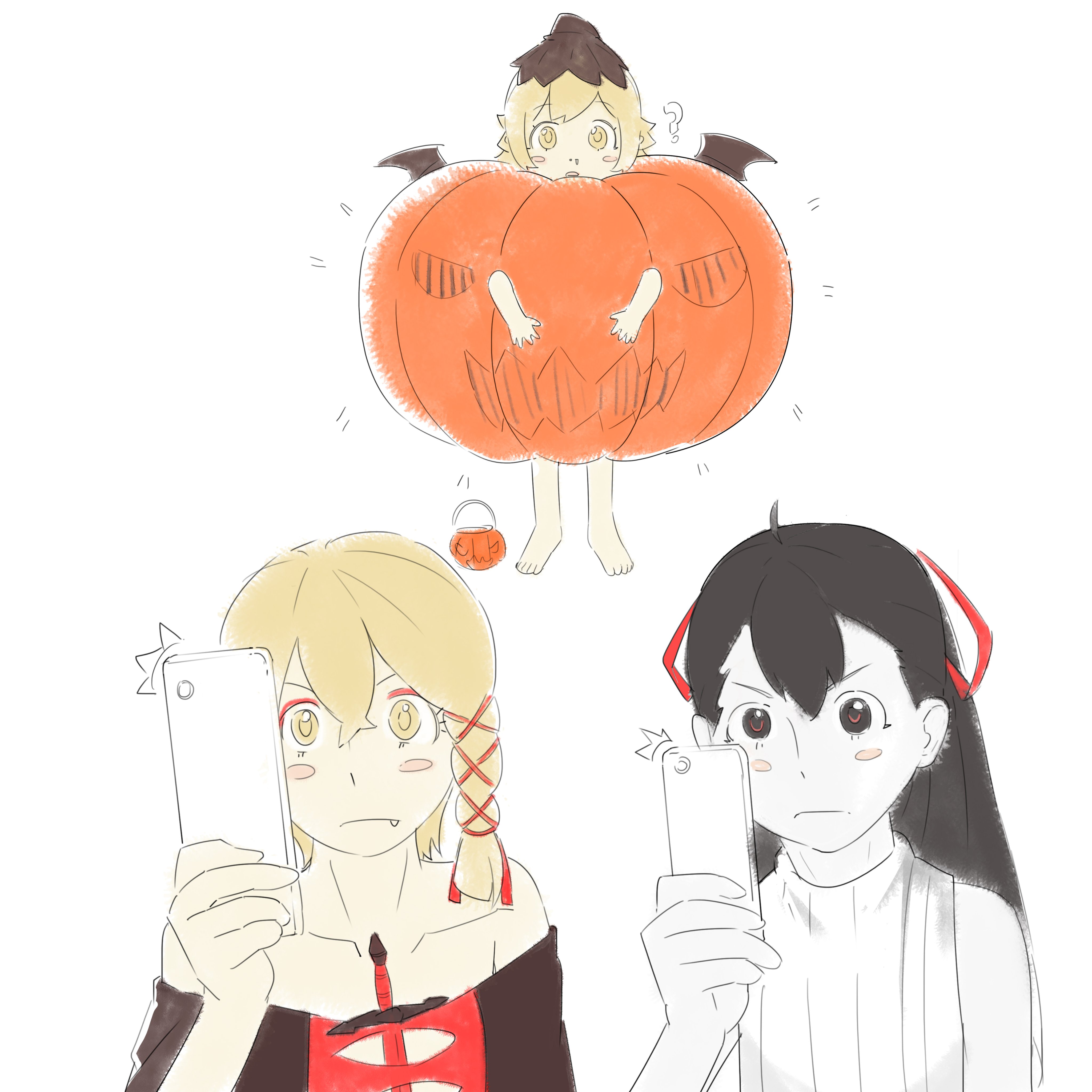 1boy 2girls ? ^^^ absurdres arm_at_side bare_arms bare_legs bat_wings black_coat black_eyes black_hair blonde_hair blush_stickers braid bright_pupils cellphone center-flap_bangs child coat collarbone dagger deathtopia_virtuoso_suicide-master eyeshadow fang fang_out full_body hair_between_eyes hair_flaps hair_ribbon halloween_bucket halloween_costume hand_up highres holding holding_phone jack-o'-lantern_cutout knife long_hair makeup monogatari_(series) multicolored_eyes multiple_girls notice_lines off_shoulder open_mouth oshino_shinobu pale_skin phone pumpkin_costume red_eyes red_eyeshadow red_ribbon ribbed_sweater ribbon shishirui_san shishirui_seishirou side_braid sleeveless sleeveless_sweater smartphone sweater swept_bangs taking_picture tress_ribbon two-tone_eyes weapon wings yellow_eyes