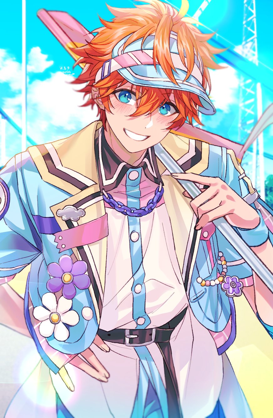 1boy akehoshi_subaru belt black_belt blue_eyes blue_hair blue_sky chain chain_necklace cloud cowboy_shot ensemble_stars! flag grin hair_between_eyes hand_on_own_hip highres holding holding_flag jacket jewelry kwanmaengg looking_at_viewer male_focus multicolored_jacket necklace official_alternate_costume open_clothes open_jacket orange_hair shirt short_hair short_sleeves sky smile solo visor_cap white_shirt wristband