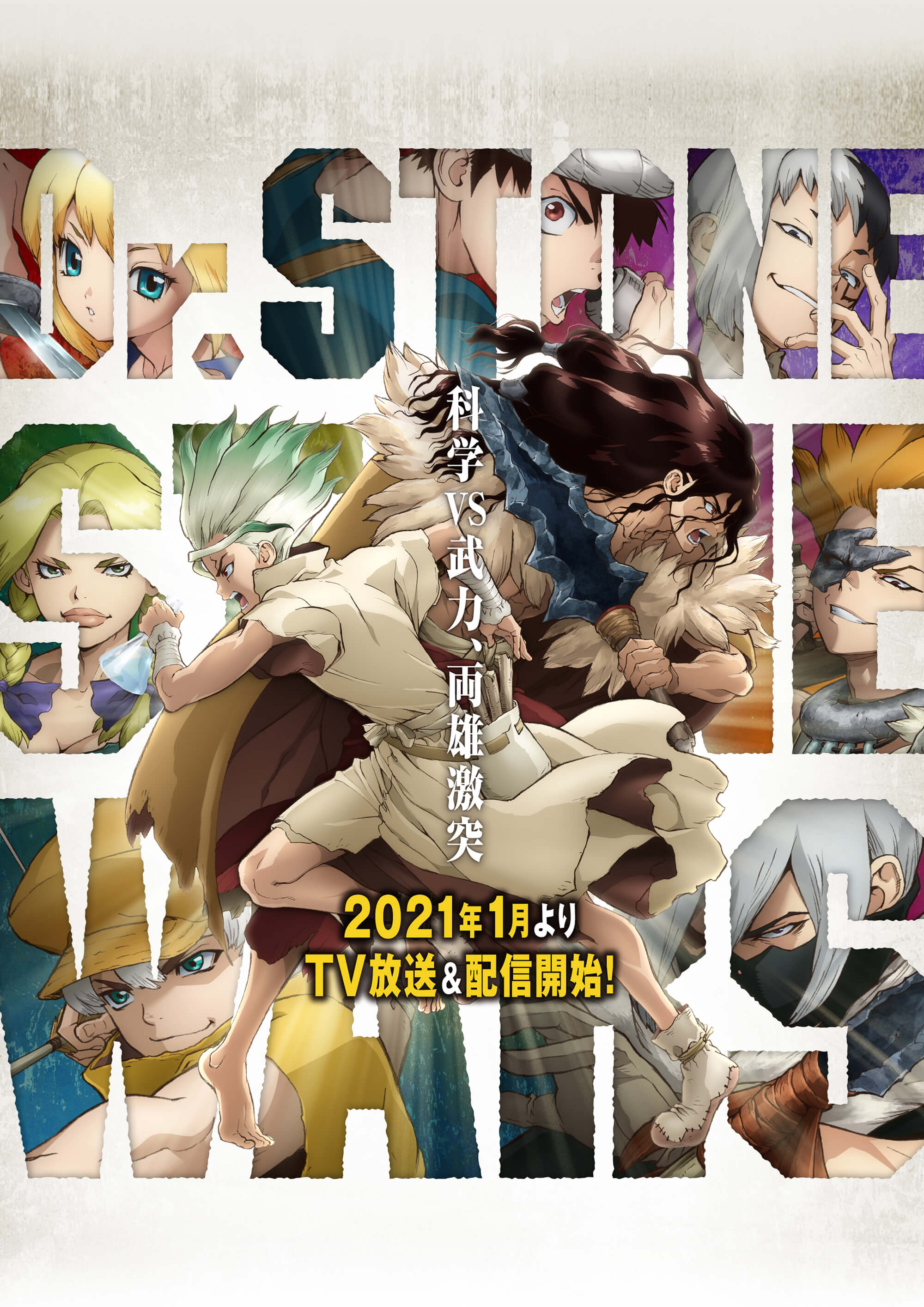 6+boys absurdres asagiri_gen barefoot black_hair blonde_hair blue_eyes brown_hair chrome_(dr._stone) dr._stone eyepatch grey_hair hanada_nikki hat headband highres holding holding_sword holding_weapon hyoga_(dr._stone) ishigami_senkuu kohaku_(dr._stone) long_hair mask mouth_mask multicolored_hair multiple_boys multiple_girls official_art orange_hair promotional_art saionji_ukyou shishiou_tsukasa short_hair smile spiked_hair sword two-tone_hair uei_you weapon white_hair