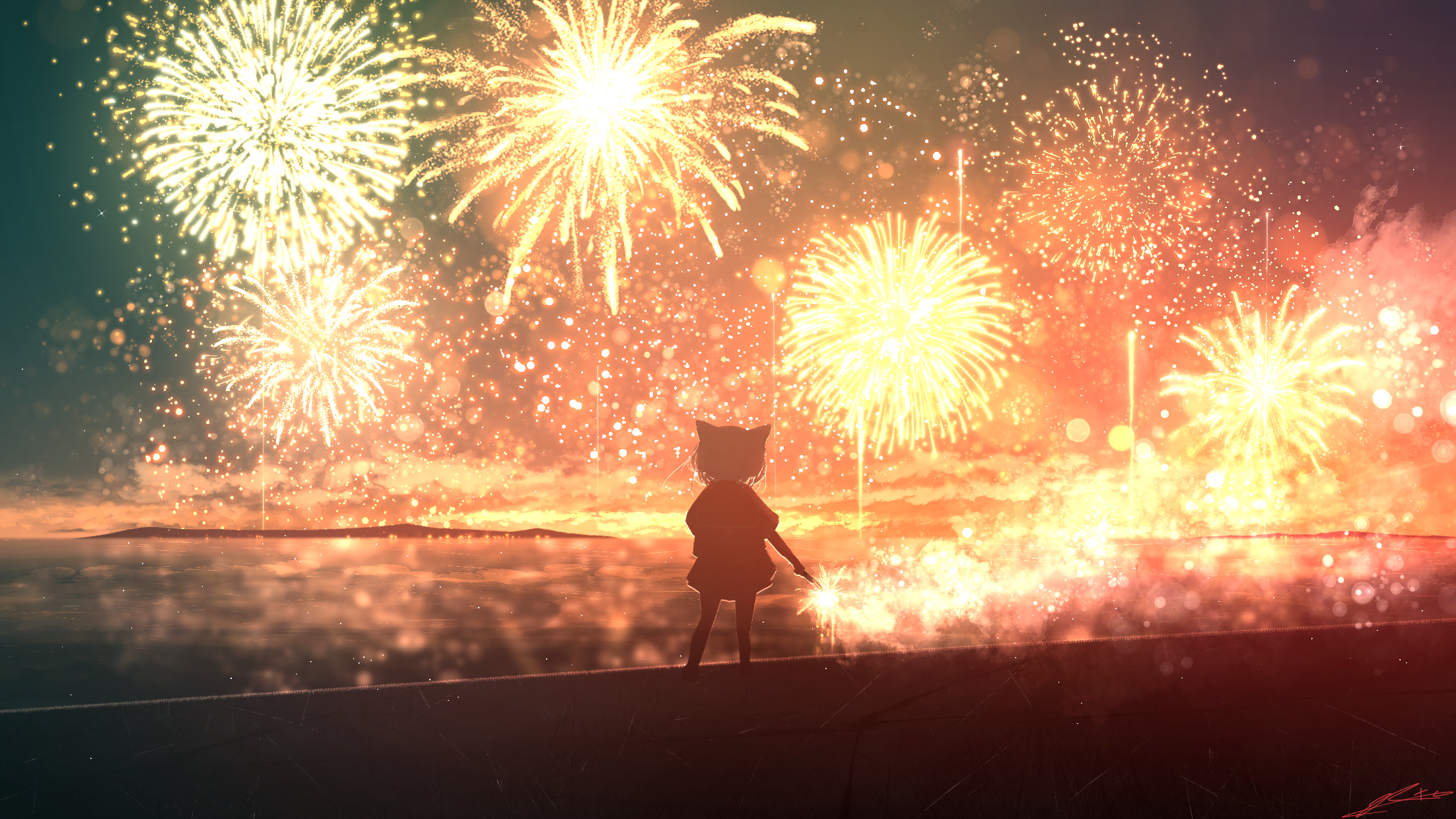 1girl animal_ears fantasy fireworks hanabi_(mobile_legends) highres landscape night original outdoors rune_xiao scenery short_hair sky standing summer white_hair