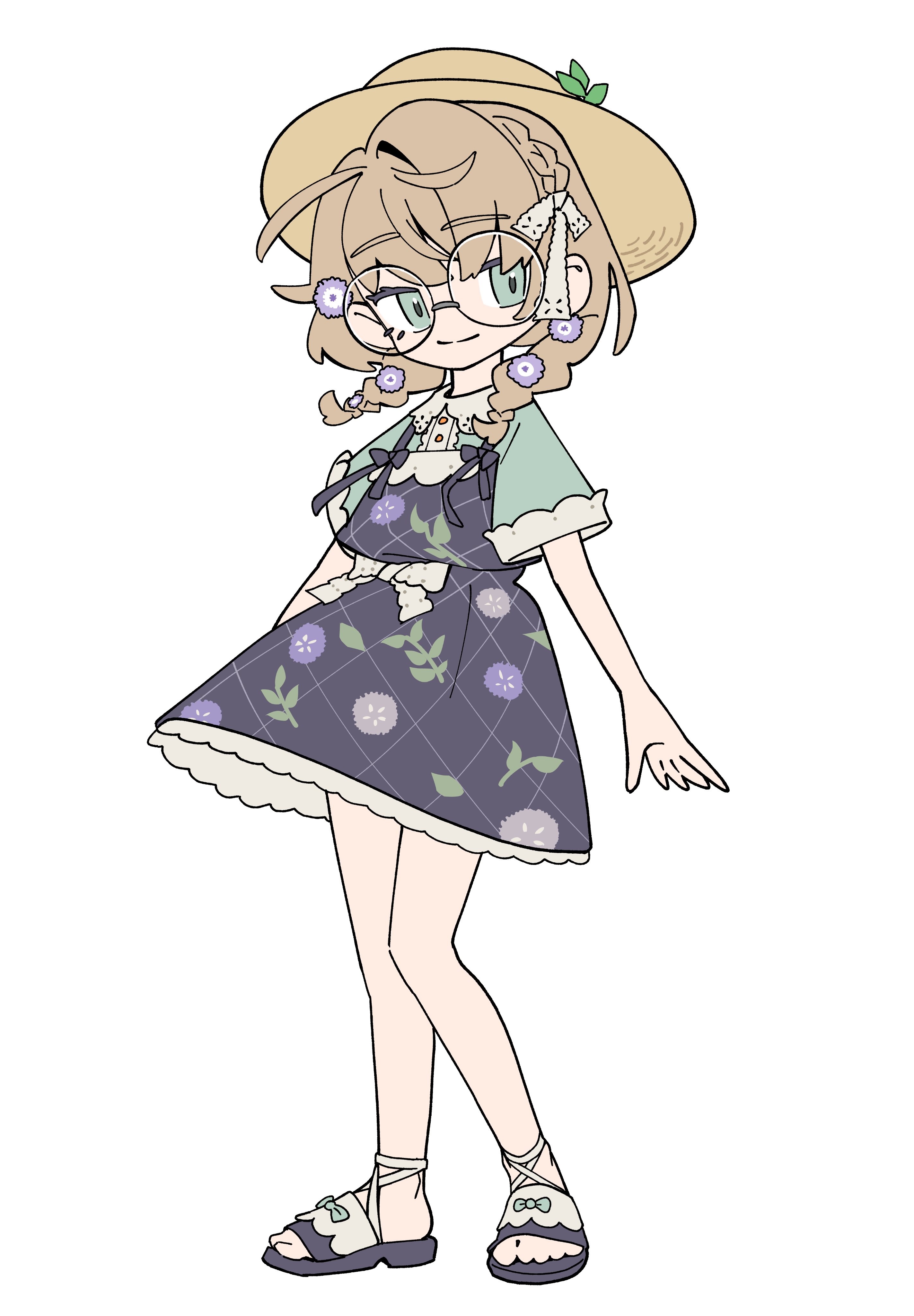 1girl absurdres black_bow black_dress bow braid brown_hair brown_hat closed_mouth collared_shirt dress floral_print floral_print_dress flower full_body glasses green_eyes green_shirt grey-framed_eyewear hair_flower hair_ornament hair_over_shoulder hair_ribbon half_crown_braid hat highres long_hair low_twin_braids nijisanji print_dress purple_flower ribbon round_eyewear sandals shirt shirt_under_dress short_sleeves simple_background single_hair_intake solo standing towel_kawata twin_braids virtual_youtuber white_background white_bow white_ribbon yaguruma_rine yaguruma_rine_(2nd_costume)