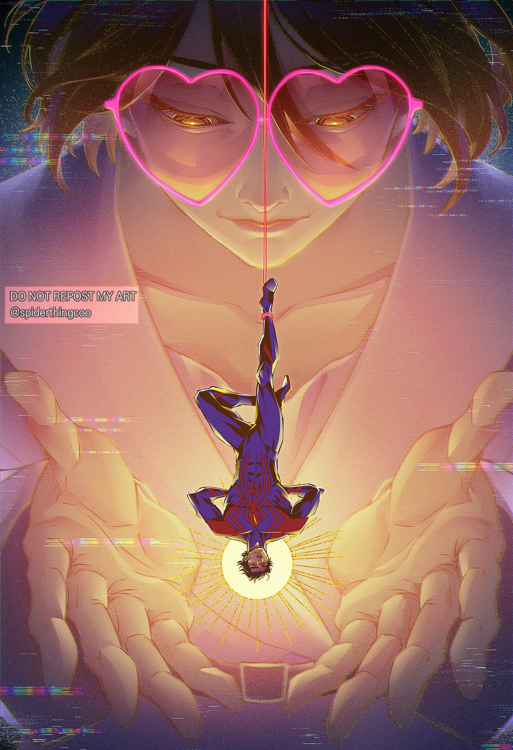 1boy 1girl animal_print belt black_hair bodysuit closed_mouth collarbone commentary commentary_request english_commentary giant giantess glitch hair_between_eyes halo halo_behind_head heart heart-shaped_eyewear highres korean_commentary looking_down lyla_(marvel) marvel miguel_o'hara mixed-language_commentary print_bodysuit shirt short_hair size_difference spider-man:_across_the_spider-verse spider-man_(series) spider-verse spider_print spiderthingcoo tarot the_hanged_man_(tarot) upside-down white_shirt