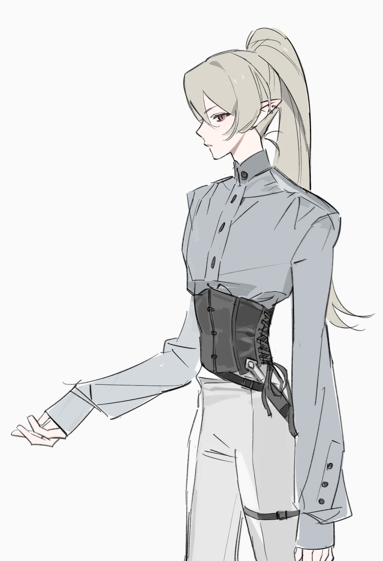 1boy alternate_costume black_corset blonde_hair corset evodtonaeco from_side hair_between_eyes high_ponytail highres long_hair long_sleeves male_focus original pants pointy_ears ponytail red_eyes shirt simple_background sleeves_past_wrists solo thigh_strap weapon white_pants