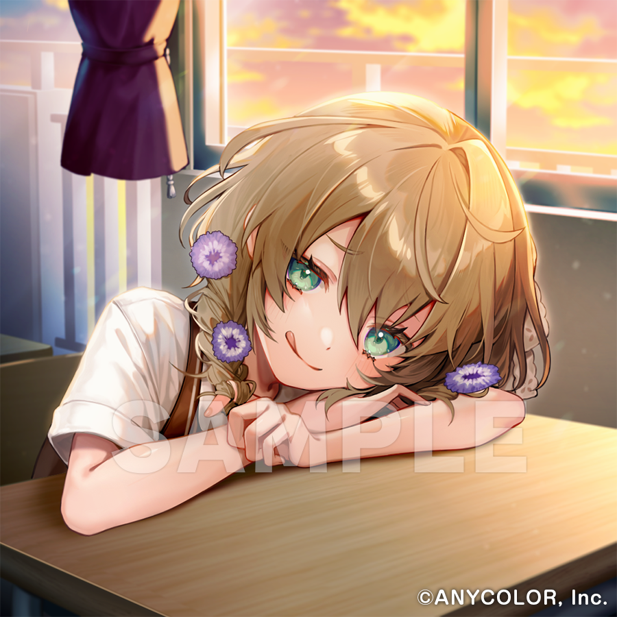 1girl :q arisato_yui arms_on_table blush braid brown_hair brown_sweater_vest chair classroom copyright_name curtains desk dress_shirt flower green_eyes hair_flower hair_ornament hair_over_shoulder hair_ribbon head_rest head_tilt long_hair looking_at_viewer low_twin_braids naughty_face nijisanji no_eyewear official_art portrait purple_flower raised_inner_eyebrows ribbon sample_watermark school_chair school_desk school_uniform shirt short_sleeves single_hair_intake solo summer_uniform sunset sweater_vest tongue tongue_out twin_braids virtual_youtuber watermark white_ribbon window yaguruma_rine yaguruma_rine_(3rd_costume)