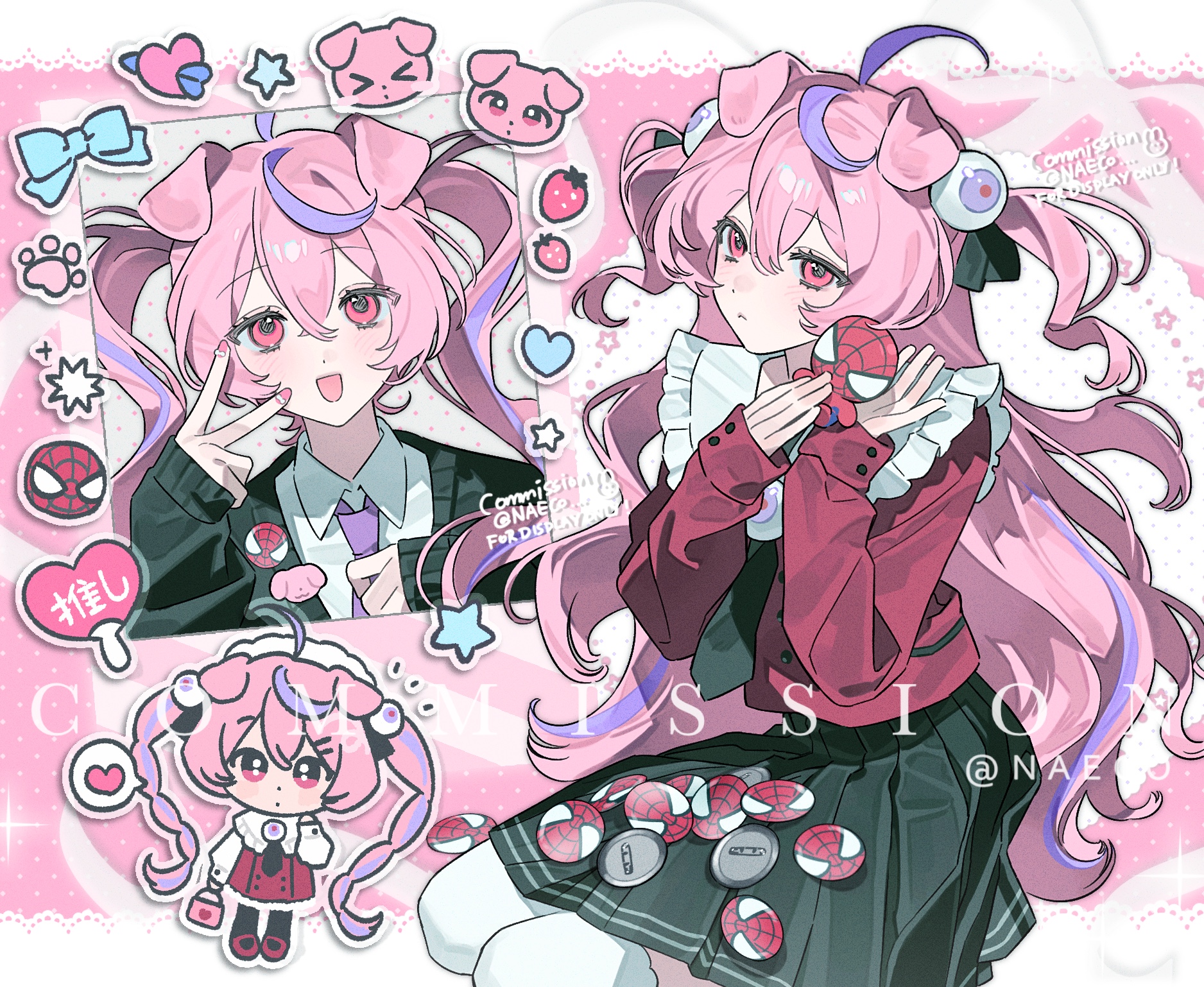 >_< 1girl animal_ears black_skirt blue_bow bow chibi chibi_inset collared_shirt dog_ears evodtonaeco frills hair_between_eyes hair_ornament heart highres holding long_hair long_sleeves multicolored_hair multiple_views necktie original pink_eyes pink_hair pink_nails pleated_skirt purple_hair purple_necktie shirt skirt spider-man spider-man_(original_suit) thighhighs twintails twitter_username white_shirt white_thighhighs