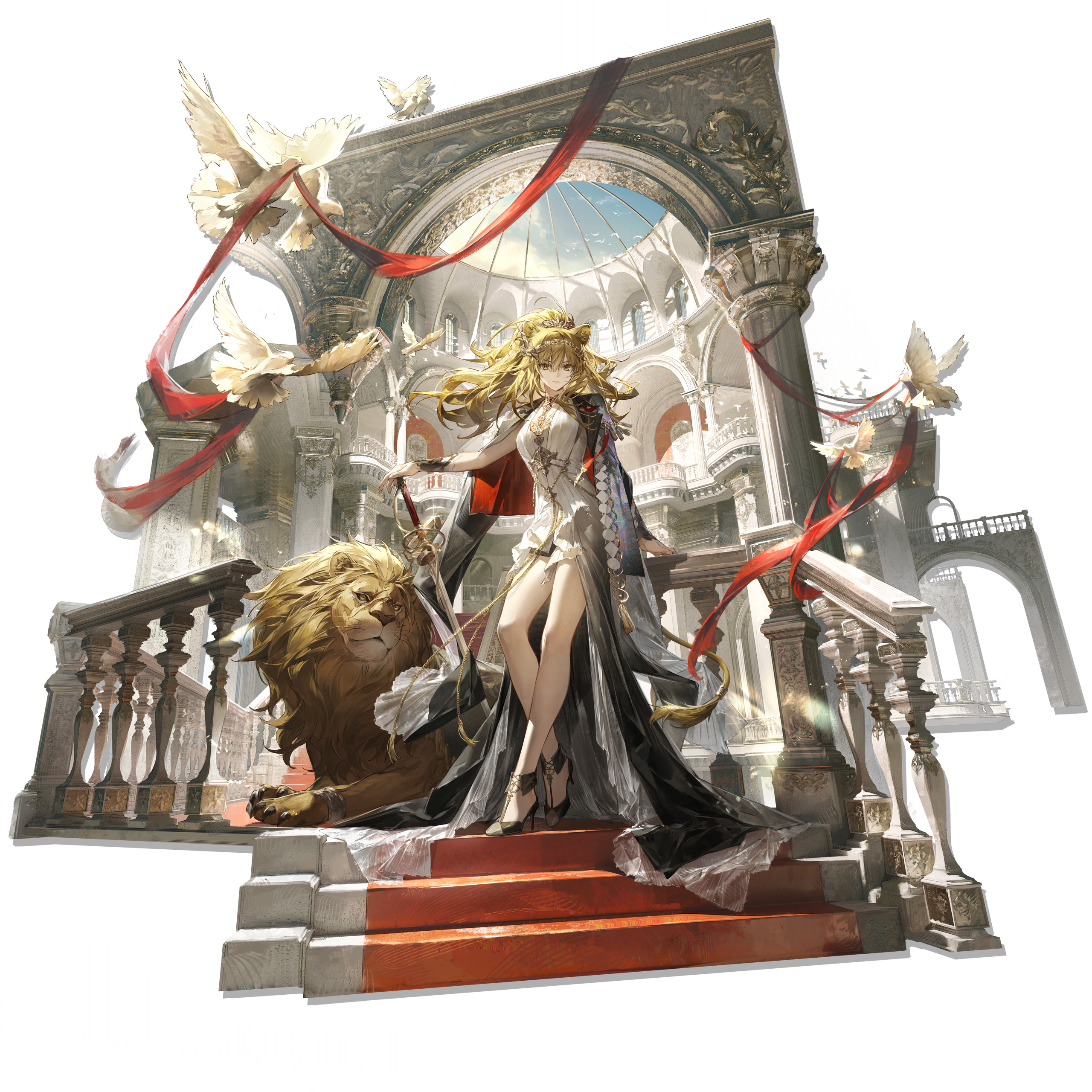 1girl absurdres against_railing animal_ear_fluff animal_ears arch architecture arknights bare_legs bird black_dress black_jacket black_shoes blonde_hair breasts circlet closed_mouth collarbone cropped_jacket dome dove dress flying frilled_skirt frills full_body gawain_(arknights) gold_circlet gold_collar gold_tiara gradient_clothes gradient_dress hair_between_eyes hand_on_railing high_heels high_ponytail highres holding holding_sword holding_weapon jacket jacket_on_shoulders lapels layered_dress lion lion_ears lion_girl lion_tail liyu_li long_hair looking_at_viewer medium_breasts notched_lapels official_alternate_costume official_art ponytail railing red_carpet scar scar_on_face serious shoes showgirl_skirt siege_(arknights) skirt solo stairs sword tail tail_ornament third-party_source tiara transparent_background two-tone_dress vina_victoria_(arknights) vina_victoria_(glorious_path)_(arknights) weapon white_dress wristband yellow_eyes