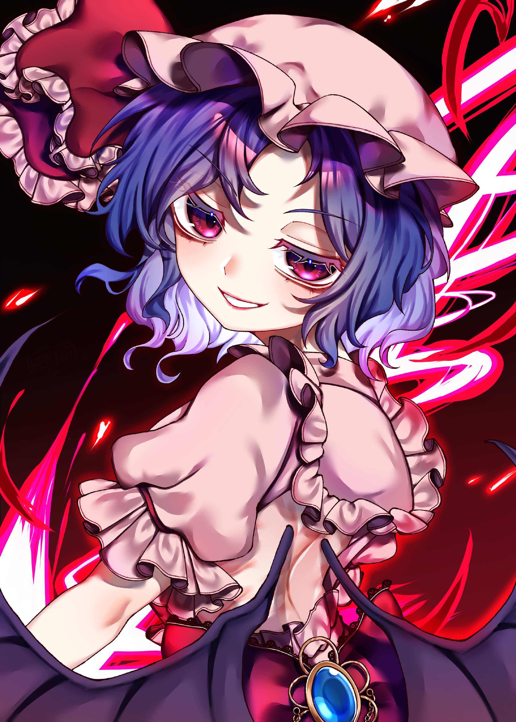 1girl absurdres back_cutout bat_wings clothing_cutout frilled_hat frilled_shirt frills gem hat hat_ribbon highres mob_cap parted_lips pink_hat pink_shirt purple_gem purple_hair red_eyes red_ribbon remilia_scarlet ribbon shigure._(tennensui) shirt short_hair smile solo touhou wings