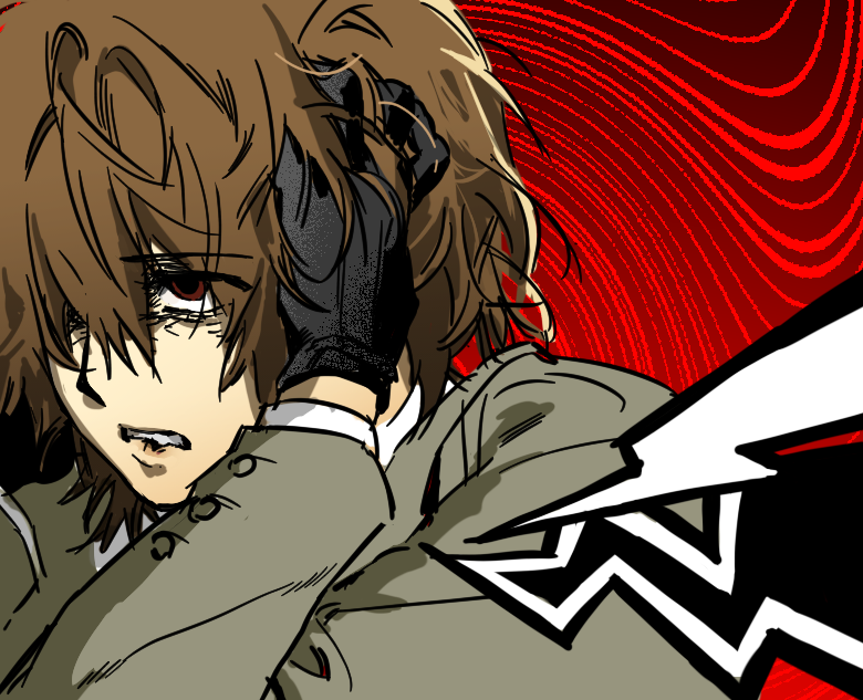 1boy akechi_gorou biting_own_lip black_gloves brown_hair coat gloves grabbing_own_hair holding holding_own_hair jacket male_focus persona persona_5 rainbubble_88 red_eyes school_uniform solo