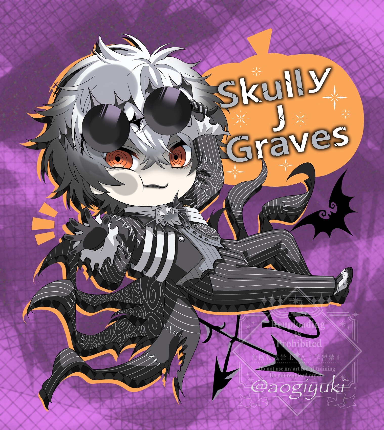 1boy aogiyuki chibi formal_clothes full_body highres jacket long_sleeves looking_at_viewer male_focus pinstripe_pattern pinstripe_suit round_eyewear short_hair skully_j._graves smile solo suit sunglasses the_nightmare_before_christmas twisted_wonderland white_hair