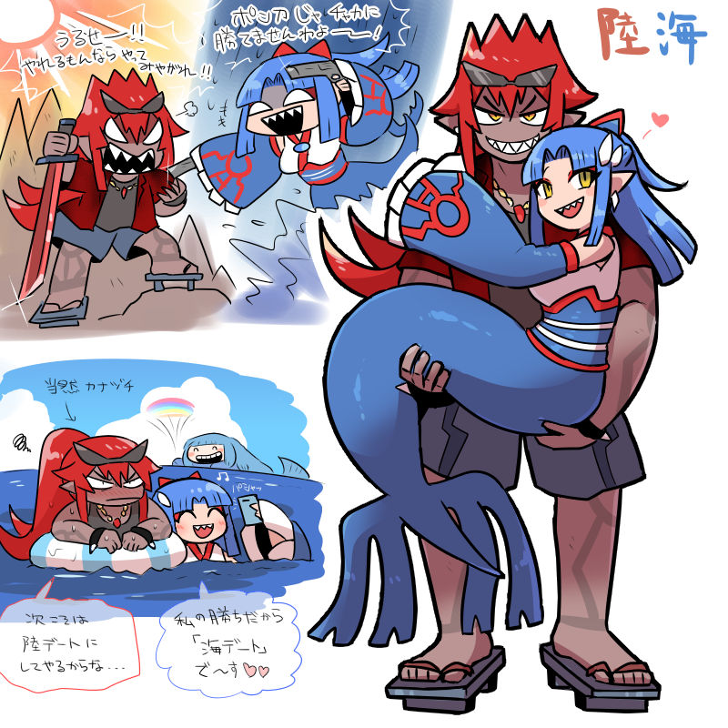 1boy 1girl :d blunt_bangs blunt_ends blush blush_stickers body_markings carrying chibi couple dark-skinned_male dark_skin detached_sleeves eyeshadow gen_3_pokemon geta grey_shirt grey_shorts groudon gun hair_intakes half-closed_eyes hetero high_ponytail holding holding_gun holding_sword holding_weapon jewelry kasugai_(de-tteiu) katana kneeless_merfolk kyogre legendary_pokemon long_hair long_sidelocks looking_at_viewer makeup mermaid monster_girl multiple_views nintendo no_nose ocean open_mouth pendant personification pointy_ears pokemon ponytail princess_carry red_eyeshadow red_hair red_trim sharp_teeth shirt shorts sidelocks slit_pupils smile swimming sword teeth translation_request weapon wide_sleeves yellow_eyes