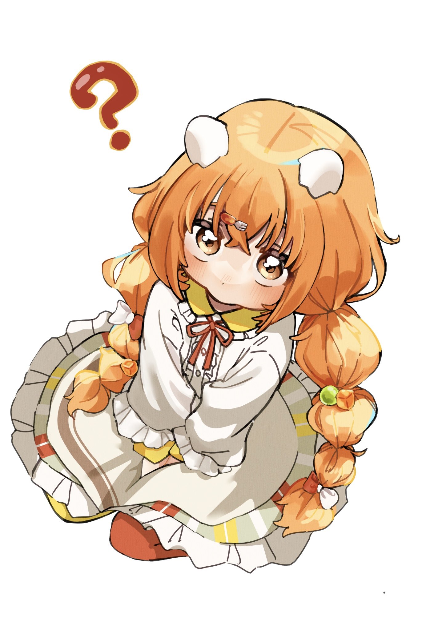 1girl ? apron asymmetrical_legwear blush braid brown_apron brown_skirt center_frills collared_dress dress egg_hair_ornament food-themed_hair_ornament fork_hair_ornament frilled_dress frills from_above full_body genkizaurusu589 hair_ornament hairclip highres kirara_tamako kirara_tamako_(1st_costume) layered_sleeves long_hair long_sleeves looking_at_viewer low_twin_braids mismatched_legwear neck_ribbon nijisanji orange_eyes orange_hair pantyhose red_pantyhose red_ribbon ribbon simple_background sitting skirt solo striped_clothes striped_skirt twin_braids two-tone_pantyhose upturned_eyes vertical-striped_clothes vertical-striped_skirt virtual_youtuber wariza white_background white_dress yellow_pantyhose