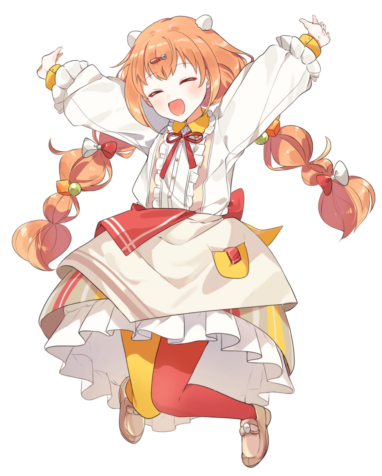 1girl 2nem_g_kti apron arms_up asymmetrical_legwear blush braid brown_apron brown_shoes brown_skirt center_frills closed_eyes collared_dress dress egg_hair_ornament food-themed_hair_ornament fork_hair_ornament frilled_dress frills full_body hair_ornament hairclip highres jumping kirara_tamako kirara_tamako_(1st_costume) knees_together_feet_apart layered_sleeves loafers long_hair long_sleeves low_twin_braids midair mismatched_legwear neck_ribbon nijisanji object_in_pocket open_mouth orange_eyes orange_hair outstretched_arms pantyhose pocket red_pantyhose red_ribbon ribbon shoes simple_background skirt smile solo spread_arms striped_clothes striped_skirt twin_braids two-tone_pantyhose vertical-striped_clothes vertical-striped_skirt virtual_youtuber white_background white_dress yellow_pantyhose