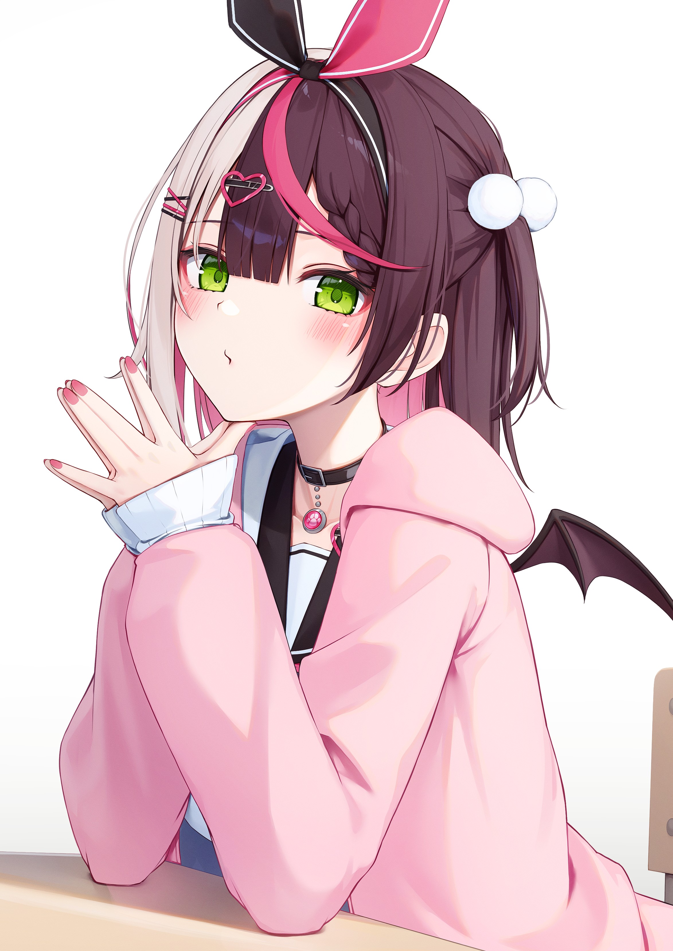 1girl absurdres bell belt_collar black_choker black_ribbon black_sailor_collar blush braid braided_bangs brown_hair choker collar collarbone demon_wings elbow_rest fingernails green_eyes hair_ornament hair_ribbon hairclip heart heart_hair_ornament highres hood hoodie long_hair long_sleeves looking_at_viewer multicolored_hair nail_polish neck_bell nyan_(reinyan_007) original own_hands_together paw_ornament pink_hair pink_hoodie pink_nails pink_ribbon pom_pom_(clothes) pom_pom_hair_ornament ribbon sailor_collar school_uniform serafuku simple_background sitting sleeves_past_wrists solo split-color_hair streaked_hair two_side_up white_background white_hair white_serafuku wings