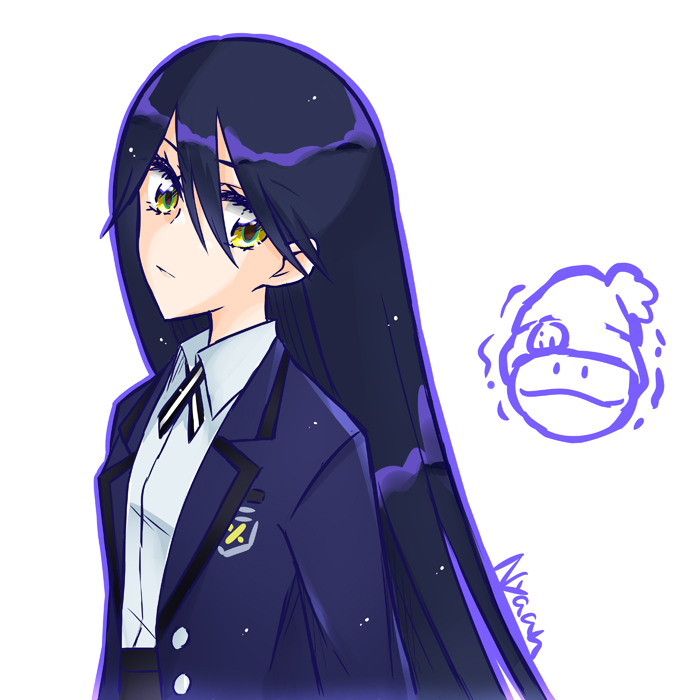 1girl aya@tsuyuri beanie black_hair character_name commentary expressionless gundam gundam_gquuuuuux hair_between_eyes haro hat jacket long_hair looking_at_viewer nyaan_(gundam_gquuuuuux) pom_pom_(clothes) pom_pom_beanie purple_jacket shirt simple_background solo white_background white_shirt yellow_eyes