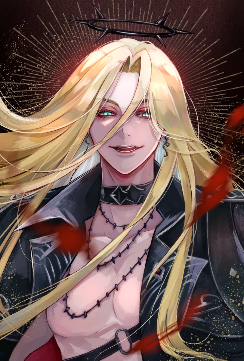 1boy abs ashkariel black_collar black_halo blonde_hair chain collar first_stage_production green_eyes halo highres jacket lameir light_smile long_hair looking_at_viewer male_focus open_clothes open_jacket open_mouth solo upper_body