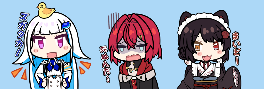 3girls :3 :d ange_katrina ange_katrina_(1st_costume) animal animal_ears animal_hair_ornament animal_on_head bird bird_on_head black_coat blue_background blue_hair blue_neckerchief blunt_bangs blush_stickers brown_hair brown_kimono buttons cardigan chibi closed_eyes coat colored_inner_hair commentary_request crossed_bangs crying dog_ears dog_girl double-breasted double-parted_bangs fangs flower hair_between_eyes hair_flower hair_intakes hair_ornament hand_up hands_on_own_hips heterochromia inui_toko inui_toko_(1st_costume) jacket japanese_clothes kimono lize_helesta lize_helesta_(1st_costume) long_hair long_sleeves looking_at_viewer low_twintails maid_headdress mitsumine_(ookami_no_oyashiro) monocle multicolored_eyes multicolored_hair multiple_girls neckerchief nijisanji no_pupils off_shoulder on_head open_mouth purple_eyes red_cardigan red_eyes red_hair sanbaka_(nijisanji) sebastian_piyodore short_hair simple_background sleeves_past_fingers sleeves_past_wrists smile thick_outlines translation_request turn_pale twintails two-tone_eyes two-tone_hair very_long_hair virtual_youtuber wavy_mouth white_hair white_headdress white_jacket yellow_bird yellow_eyes
