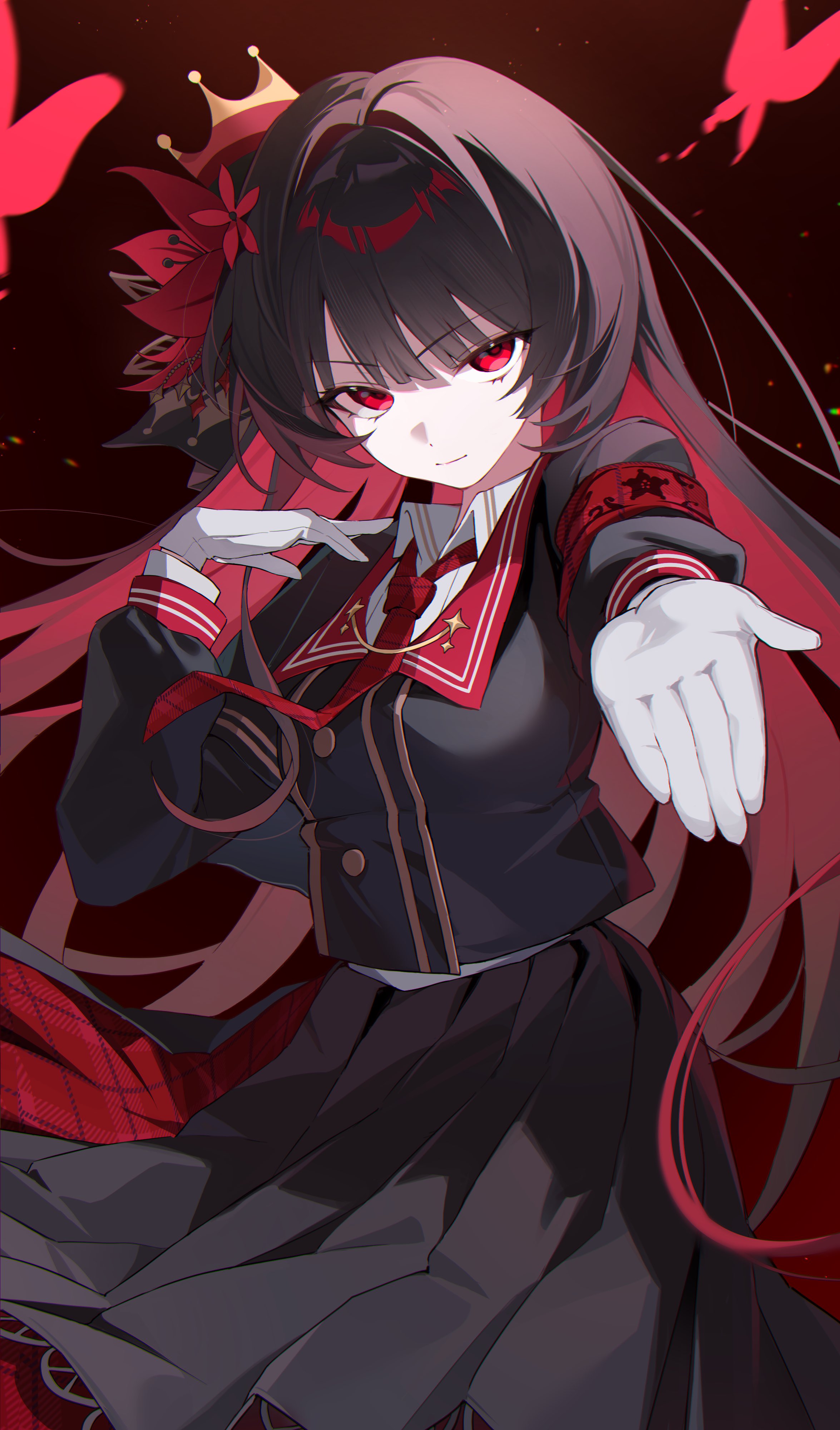 1girl absurdres armband black_hair black_shirt black_skirt breasts bug butterfly crown determined facing_down gloves highres insect looking_at_viewer mahou_shoujo_no_majo_saiban medium_breasts mini_crown necktie nikaido_hiro pomeo_dayo red_armband red_background red_butterfly red_eyes red_necktie shirt skirt v-shaped_eyebrows white_gloves